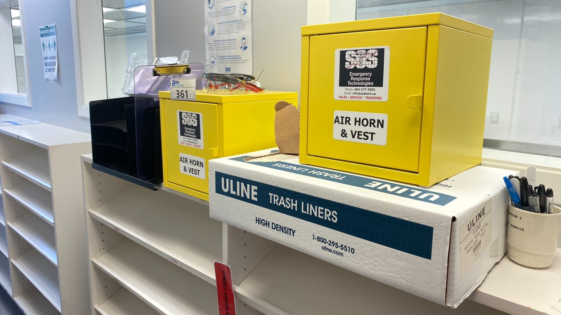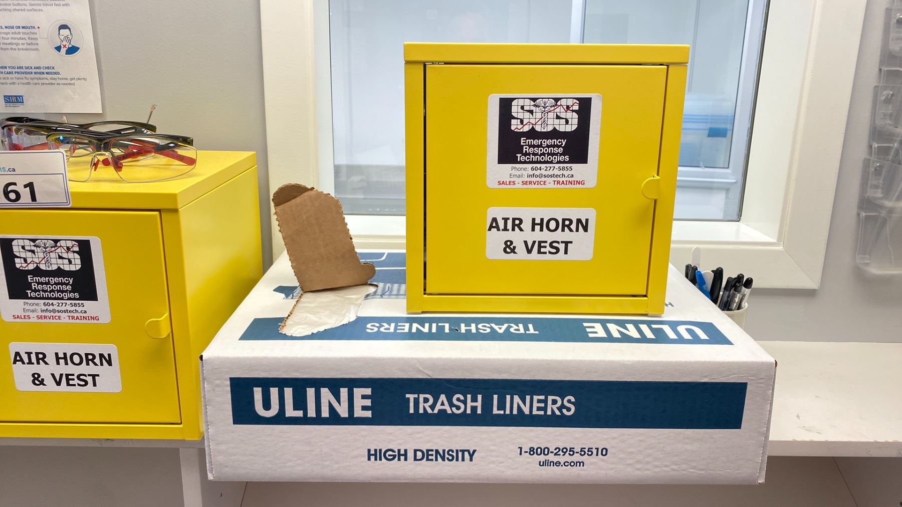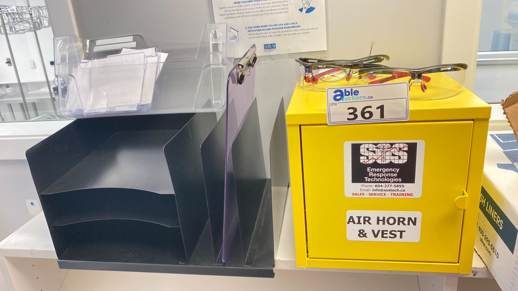 SOS AIR HORN AND VEST WALL MOUNT KITS, ASSORTED OFFICE SUPPLIES AND ULINE TRASH LINERS