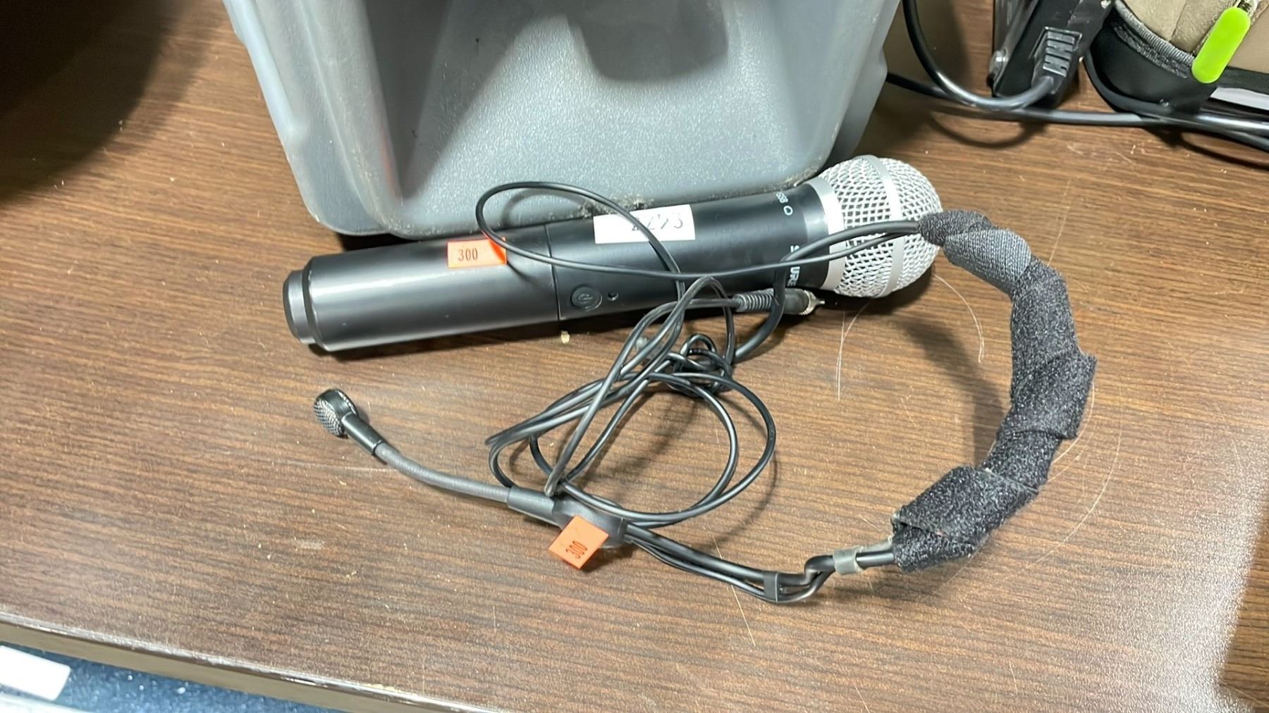 SOUND PROJECTIONS VM-2 PORTABLE PROFESSIONAL PA LOUDSPEAKER WITH POWER CABLE, SHURE PG58 WIRELESS HANDHELD MICROPHONE & SENNHEISER ME 3-11 WIRELESS HEADSET *NO BELT PACK*