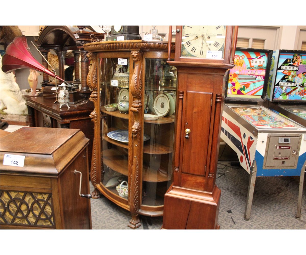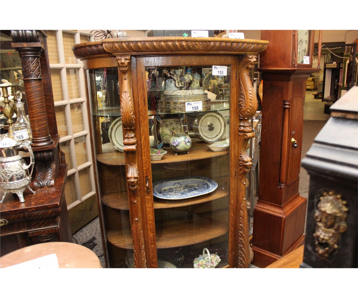 SPECTACULAR TRIPLE CURVE, QUARTER SAWN OAK DISPLAY CABINET WITH CARVED FRONT AND CLAW FEET