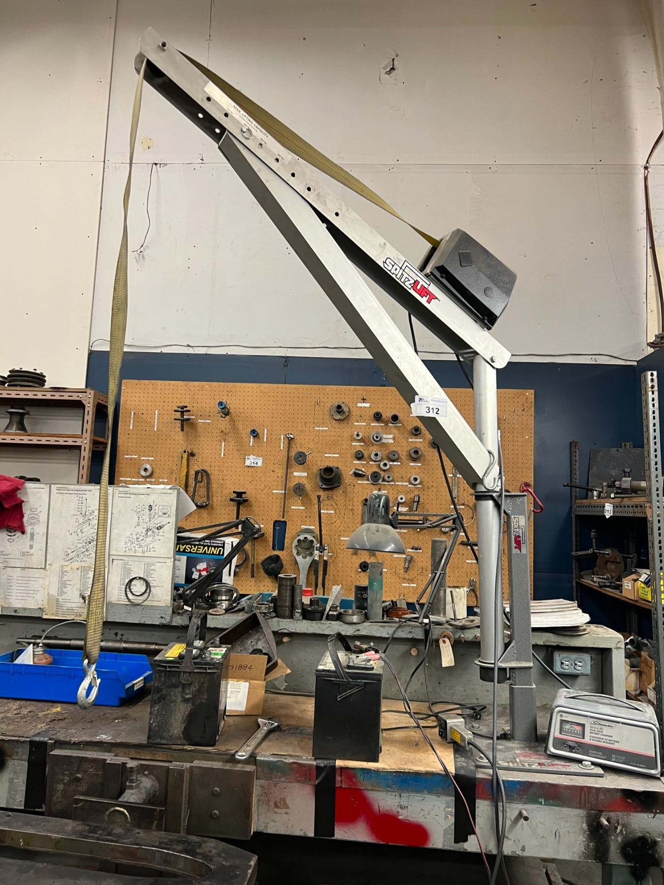 SPITZ LIFT 900 LB CAPACITY. NEEDS TO BE MOUNTED ON A BENCH. WORKS WELL. MUST BE REMOVED FROM BENCH SO BRING TOOLS