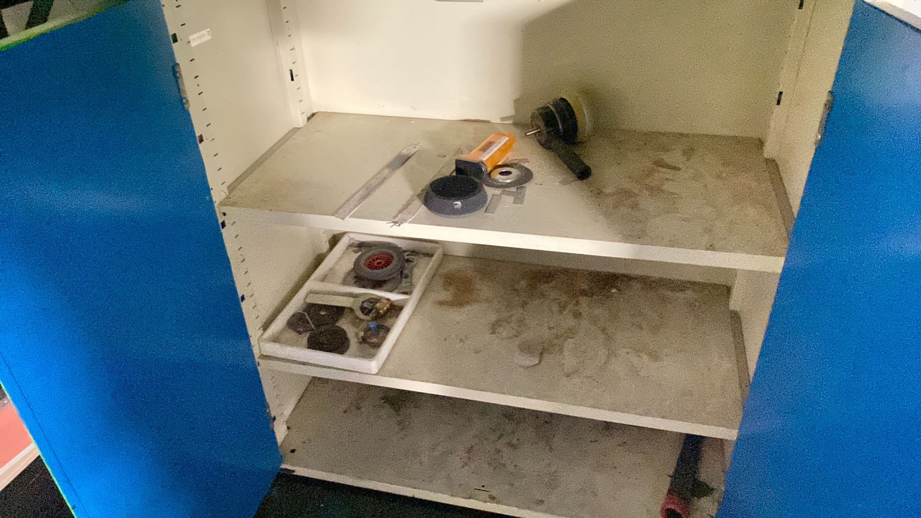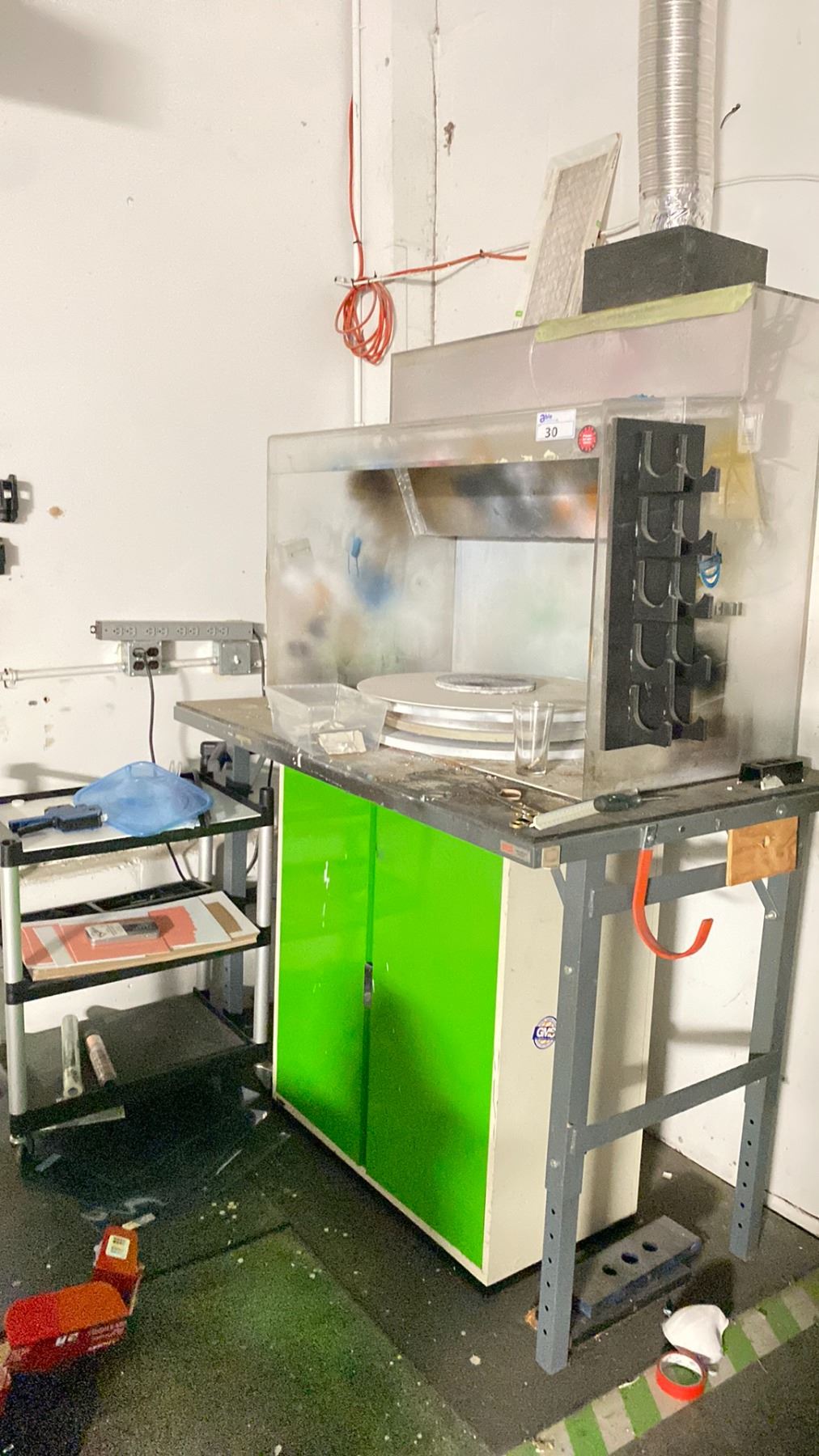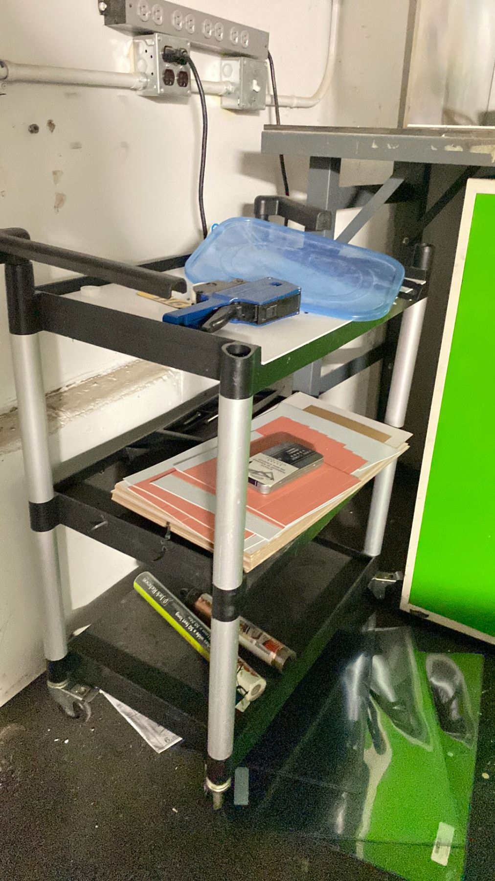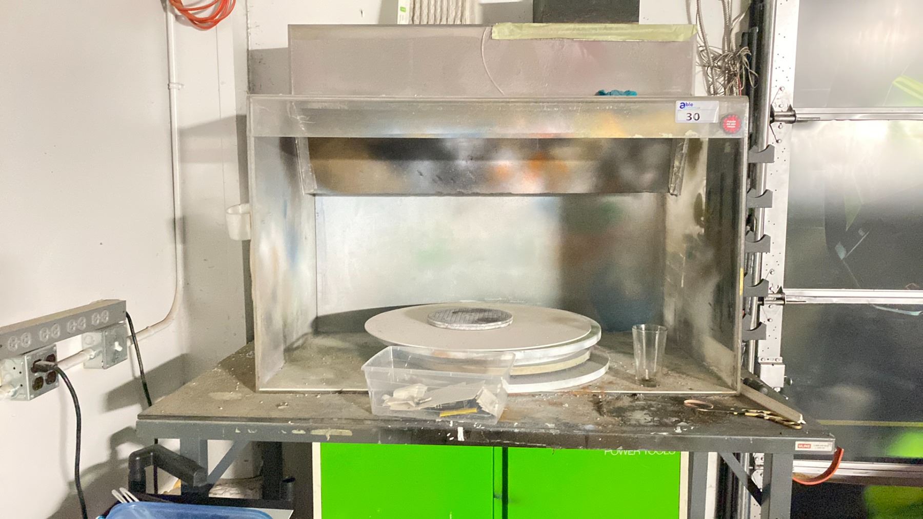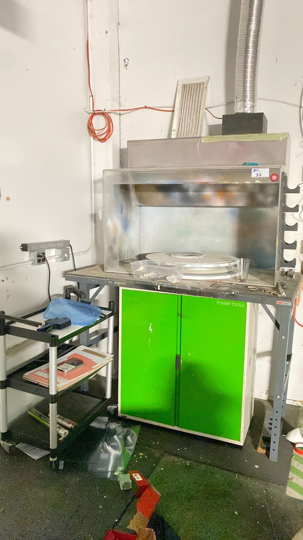 SPRAY PAINTING STATION WITH EXHAUST, PORTABLE 3-TIER CART WITH CONTENTS & METAL 2 DOOR CABINET WITH CONTENTS *ITEM LOCATED OFF SITE IN VANCOUVER*