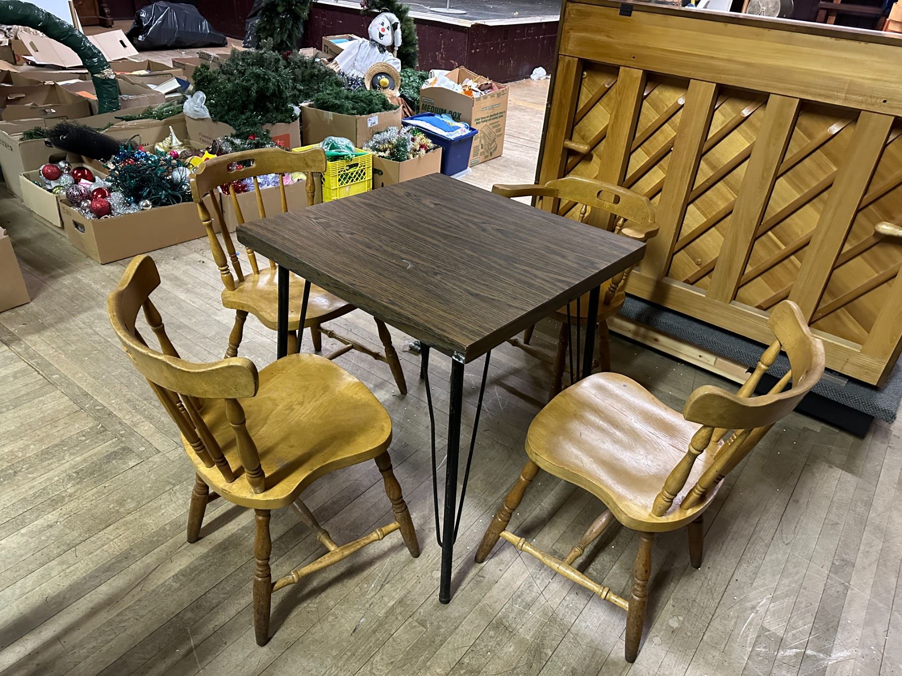 SQUARE DINING TABLE 28  WITH 4 ASSORTED WOOD CHAIRS