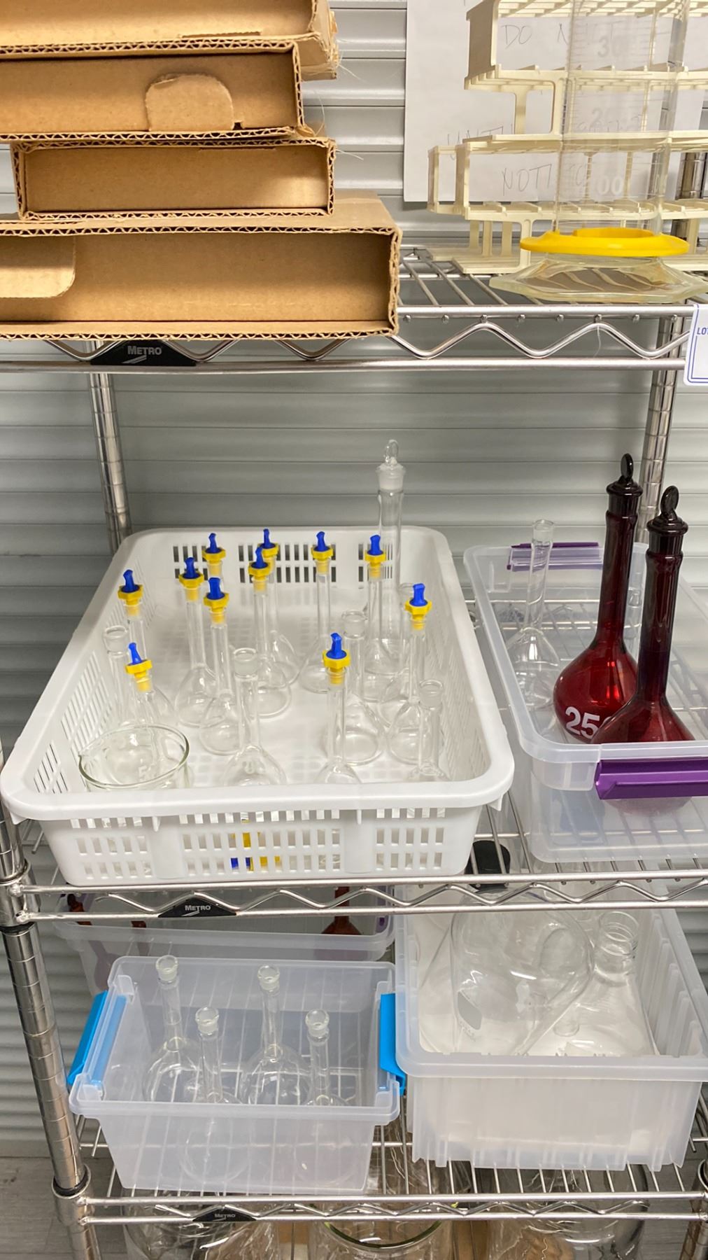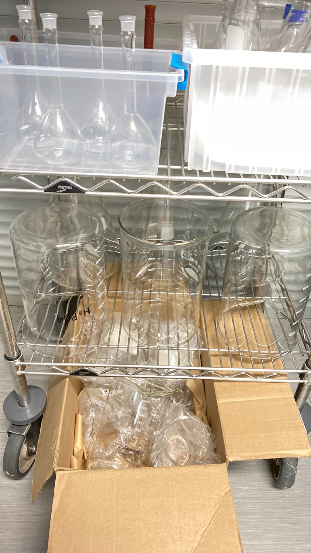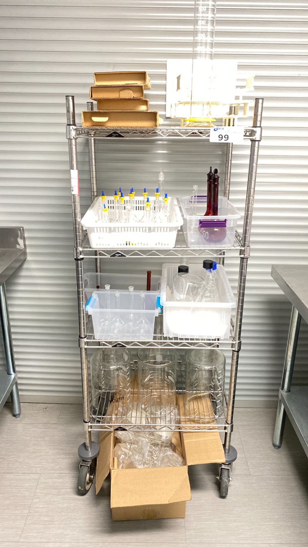 SQUARE METRO RACK WITH CONTENTS (ASSORTED GLASSWARE AND BEAKERS)