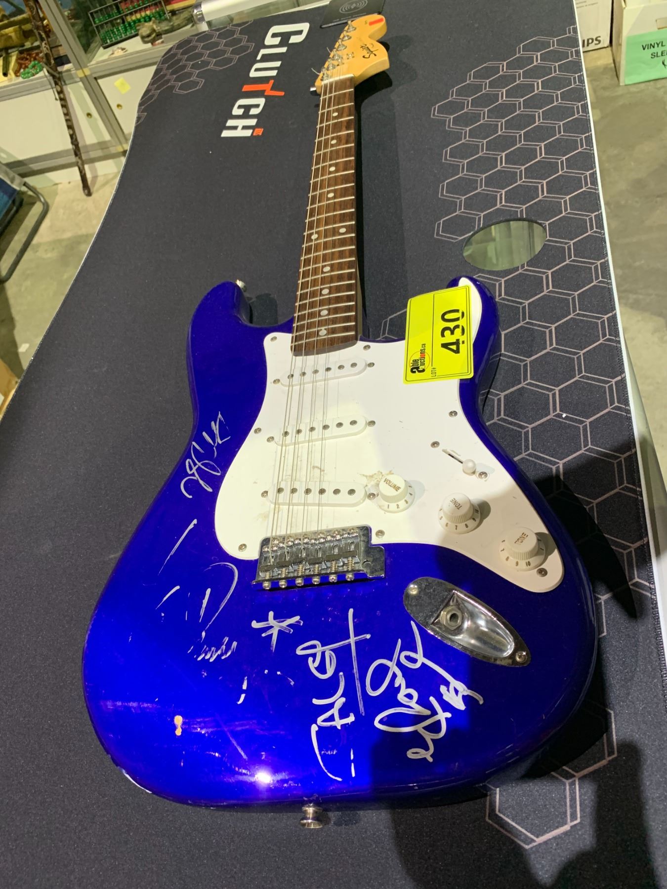 SQUIER STRAP BY FENDER ELECTRIC GUITAR- UNKNOWN SIGNATURES AND MISSING STRINGS
