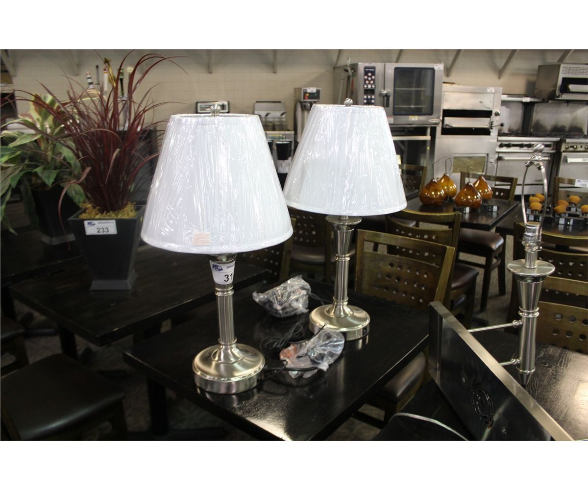 SS TABLE LAMP WITH WHITE SHADE AND MEDIA PORT