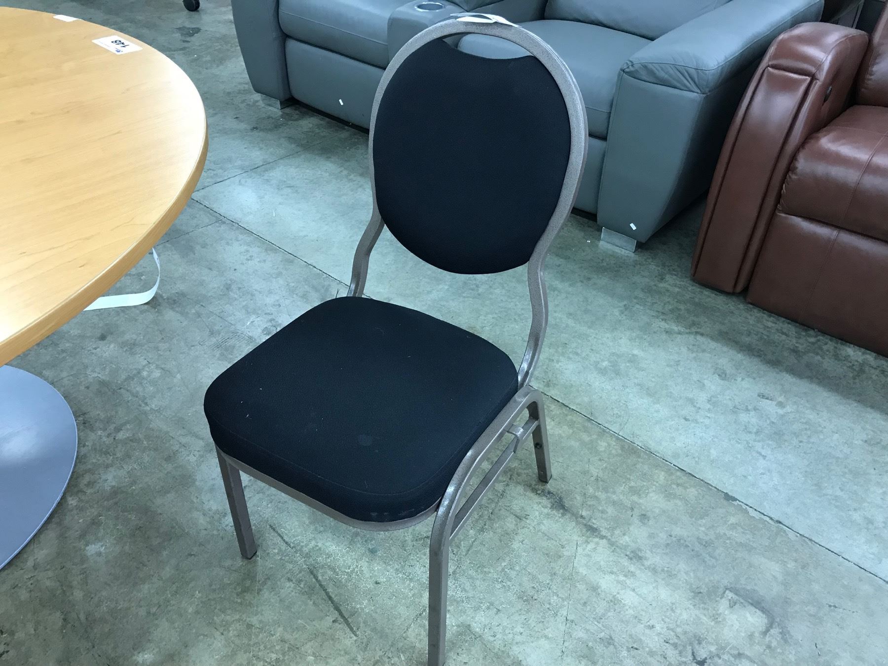 STACK OF 10 BLACK CLOTH BACK AND BROWN METAL FRAME, GANGABLE STACKING CHAIRS