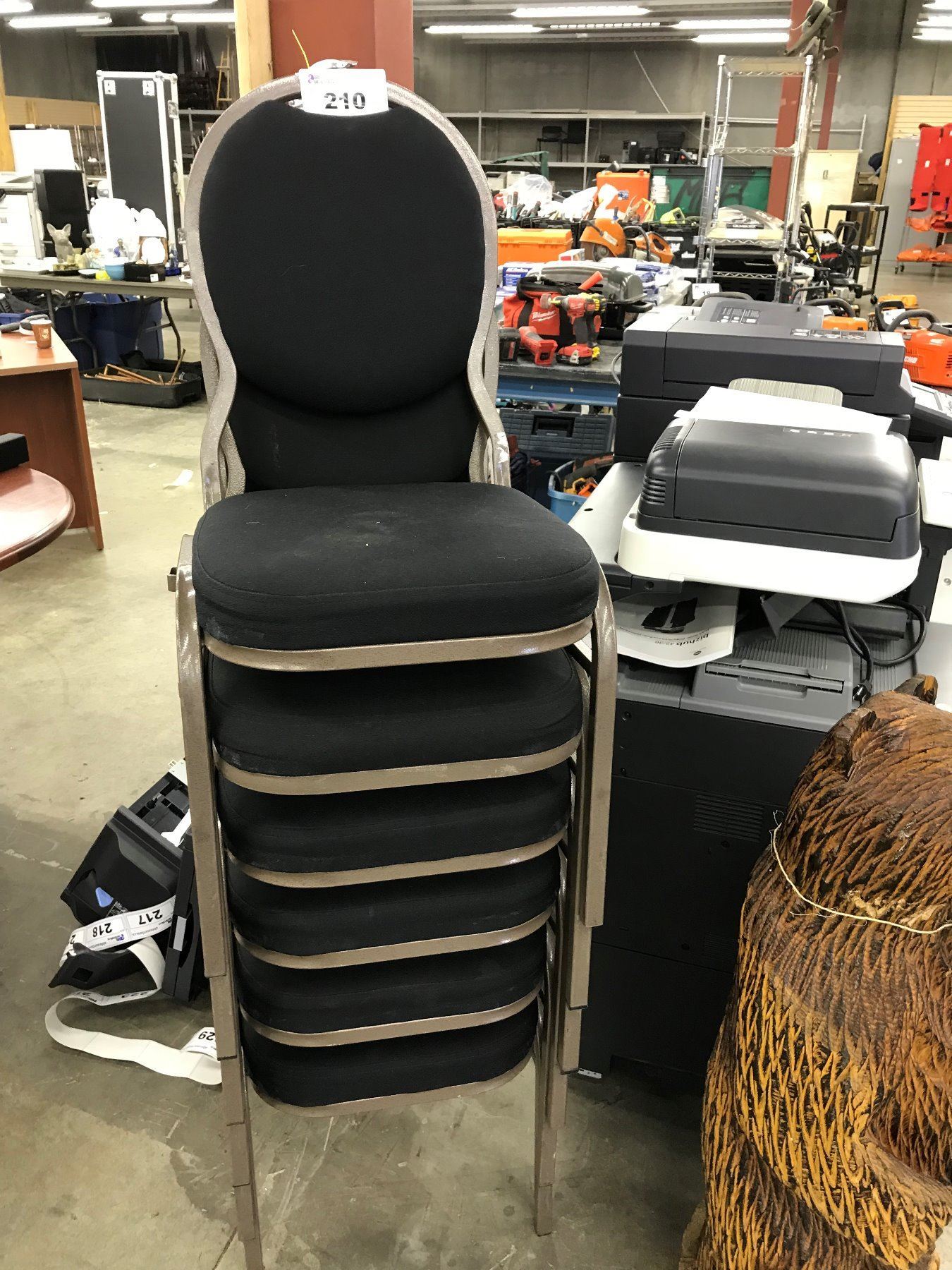 STACK OF 10 BLACK FABRIC AND BROWN METAL FRAME STACKING, GANGABLE BANQUET CHAIRS