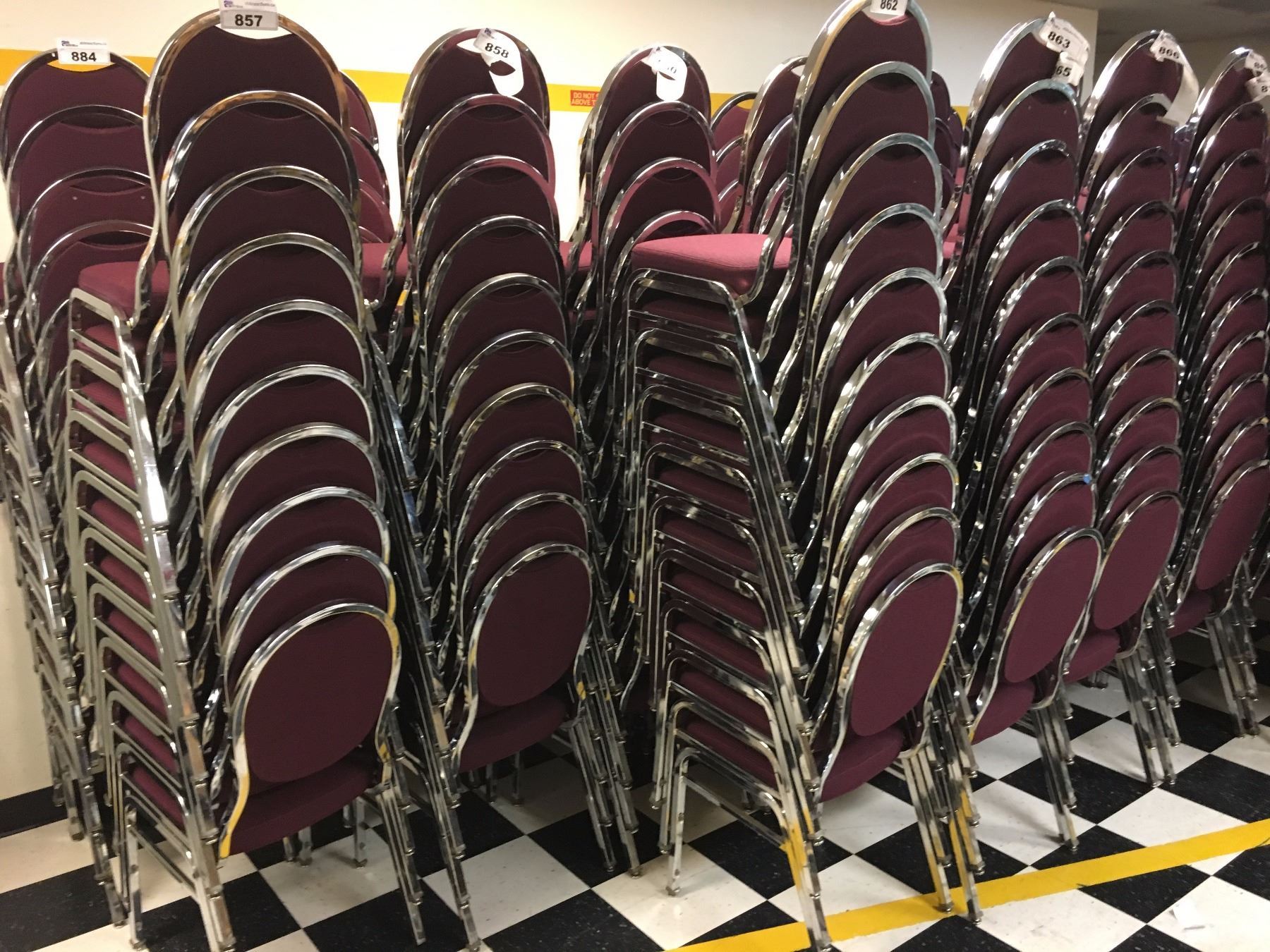 STACK OF 10 BURGUNDY AND METAL FRAME BANQUET CHAIRS