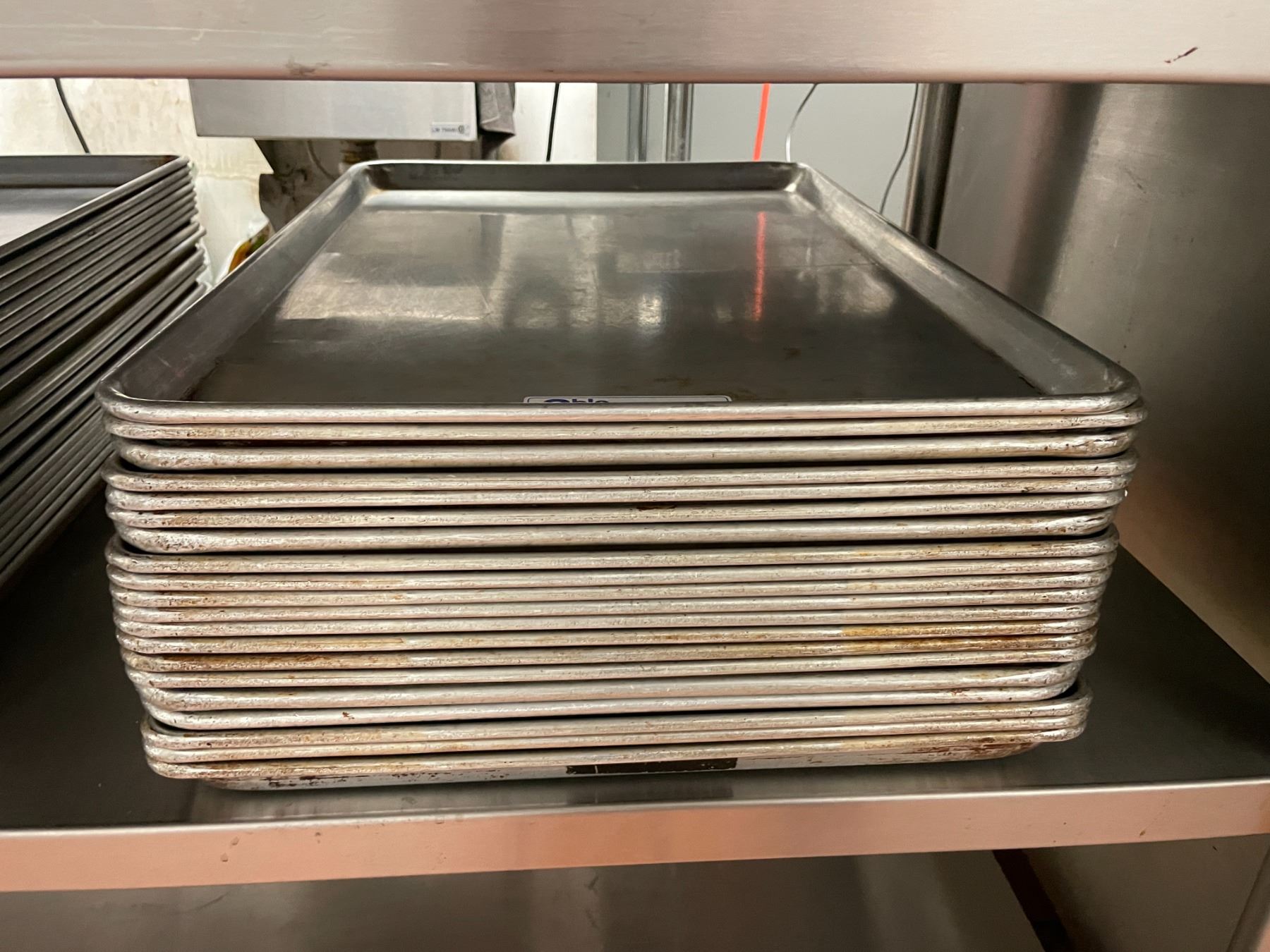 STACK OF 20 COMMERCIAL 26 W X 18 D BAKING SHEETS