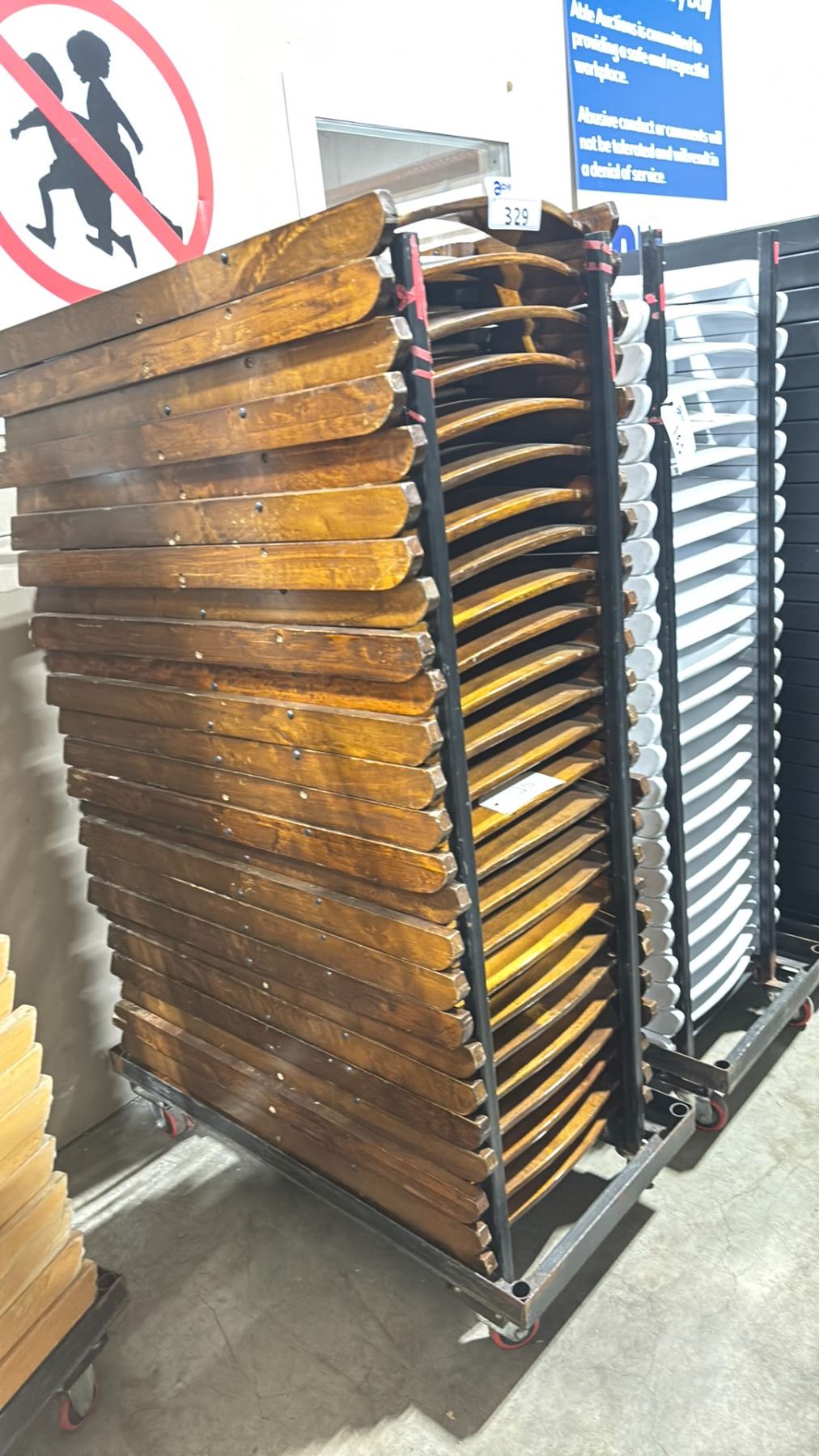 STACK OF 25 DARK WOOD FOLDING EVENT CHAIRS ON MOBILE CHAIR CART *CART INCLUDED*