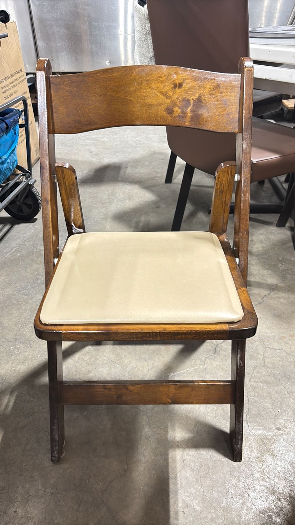 STACK OF 25 DARK WOOD FOLDING EVENT CHAIRS ON MOBILE CHAIR CART *CART INCLUDED*