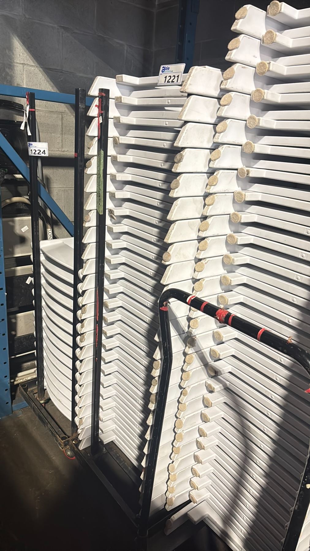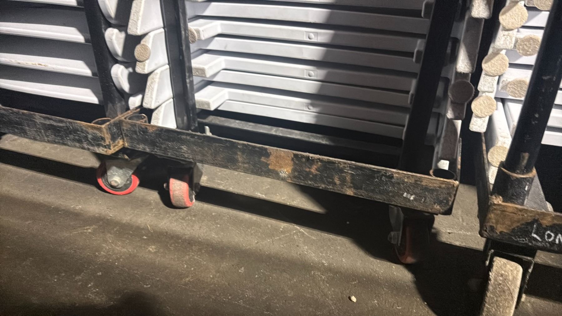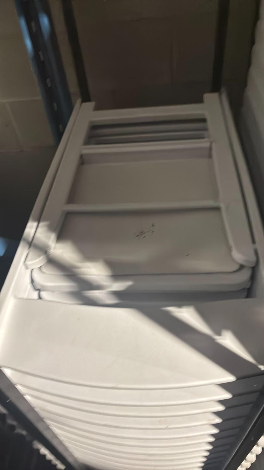 STACK OF 25 WHITE PLASTIC FOLDING EVENT CHAIRS ON MOBILE CHAIR CART *CART INCLUDED*