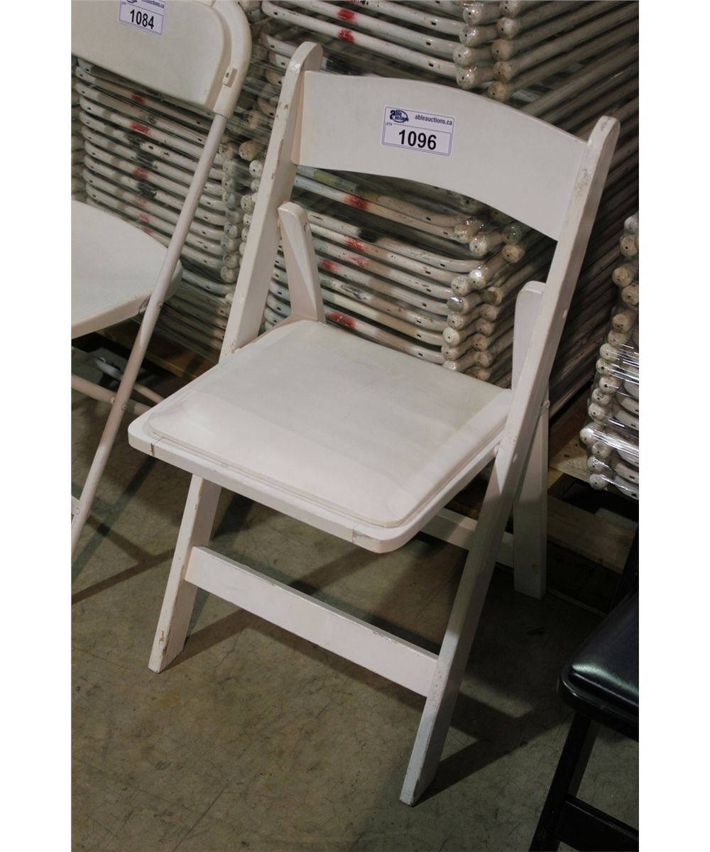 STACK OF 26 WHITE WOODEN PADDED FOLDING BANQUET CHAIRS