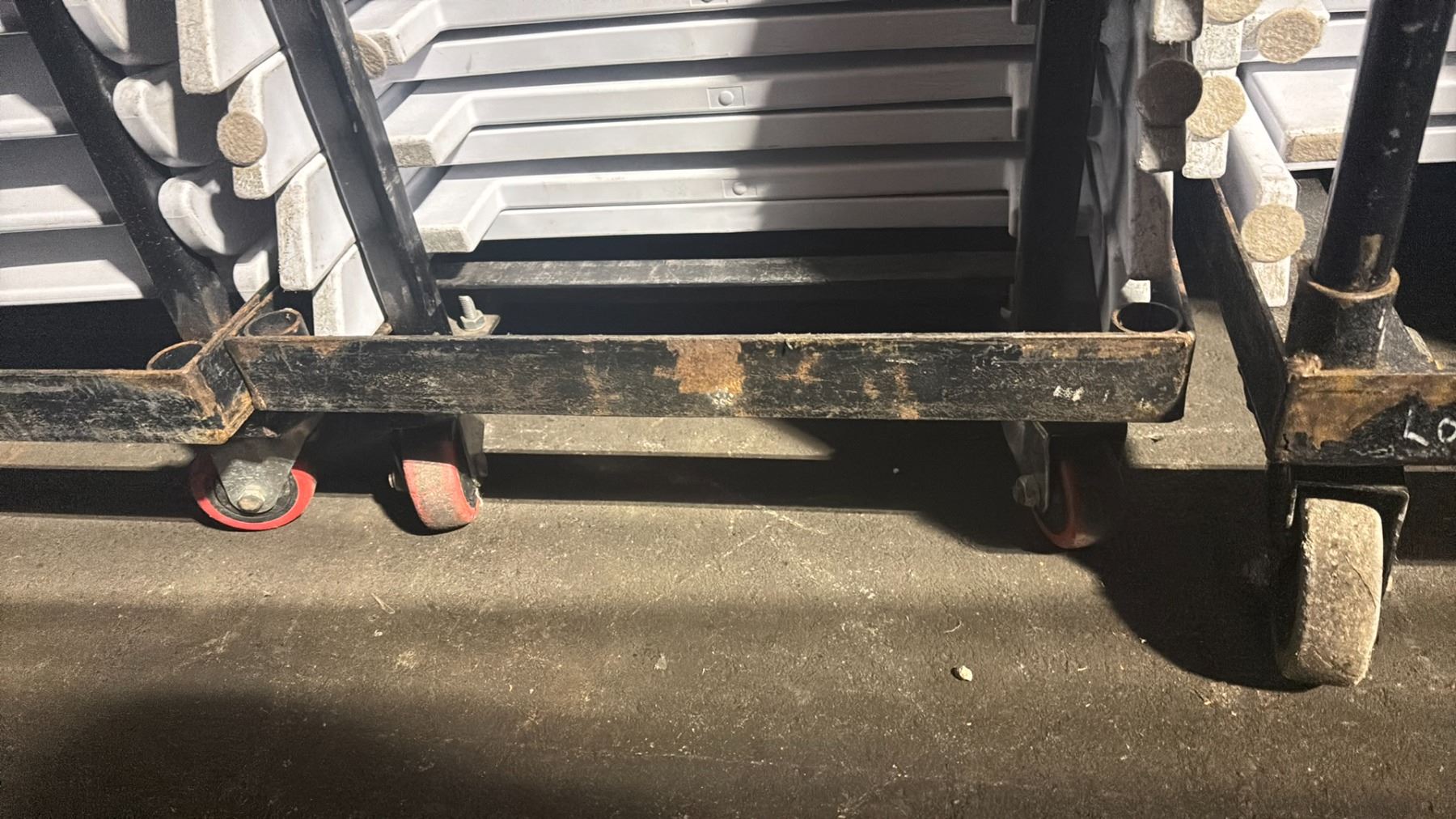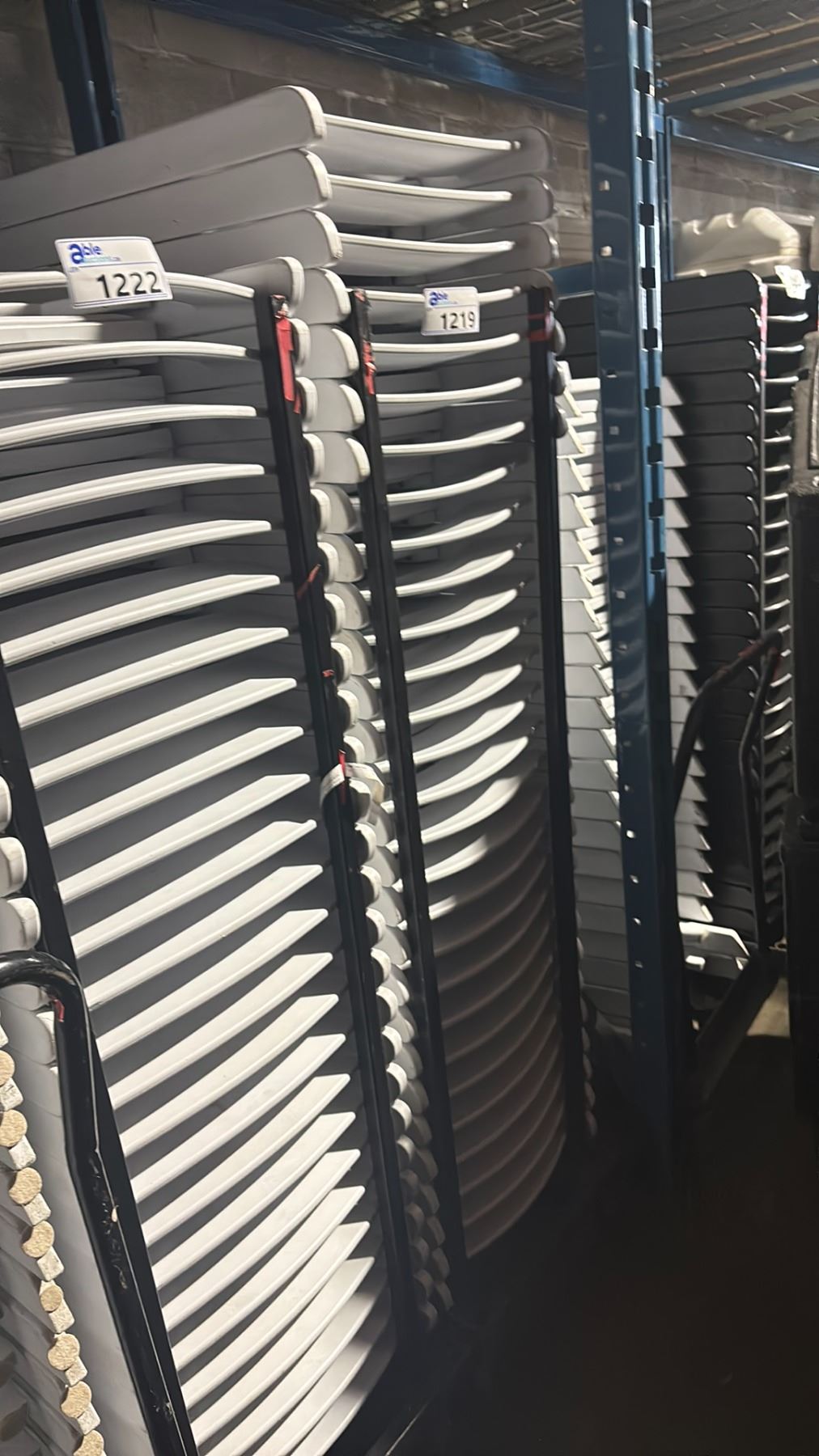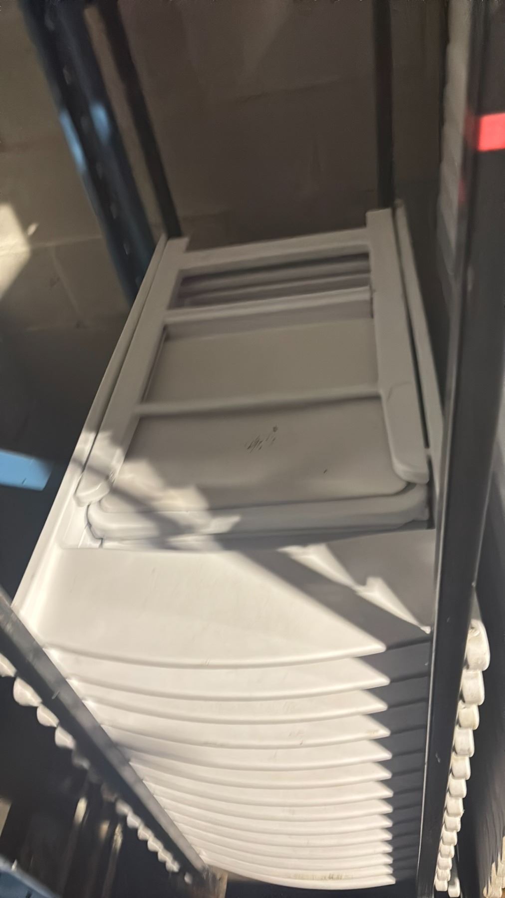 STACK OF 28 WHITE PLASTIC FOLDING EVENT CHAIRS ON MOBILE CHAIR CART *CART INCLUDED*