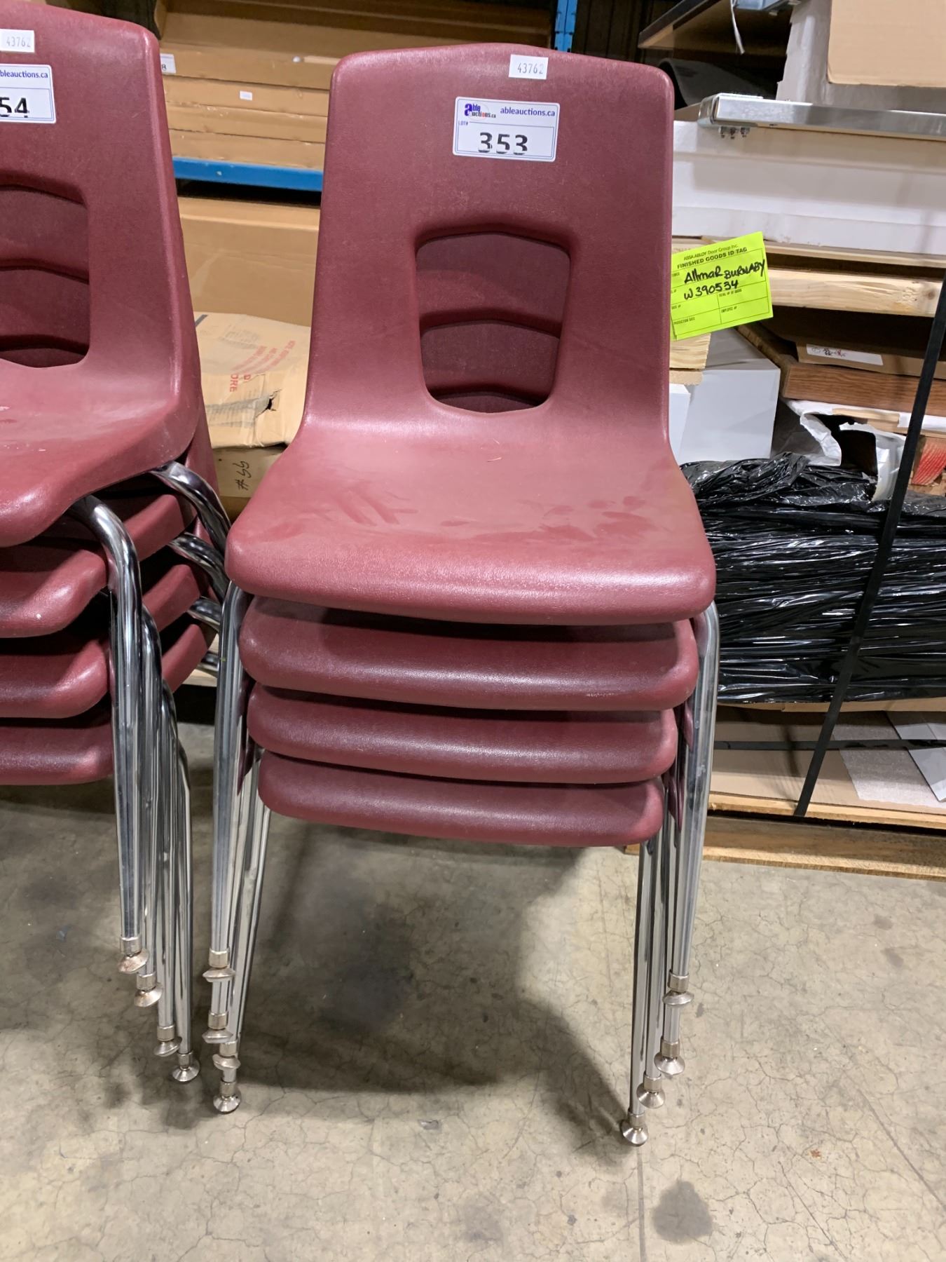 STACK OF 4 BURGUNDY METAL FRAMED PLASTIC STACKING CHILDRENS CHAIRS