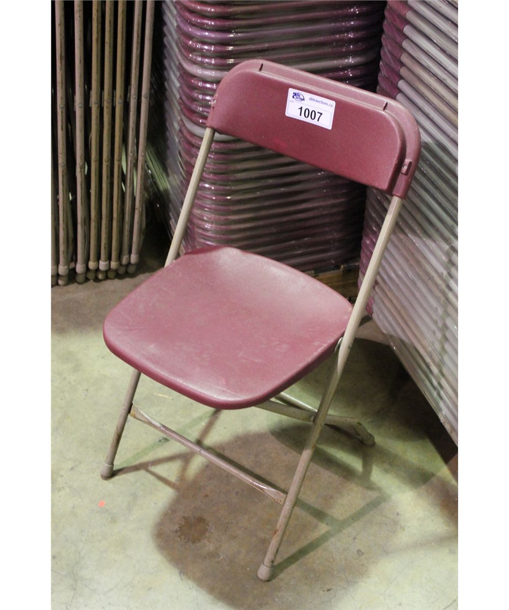 STACK OF 50 BURGUNDY PLASTIC FOLDING BANQUET CHAIRS