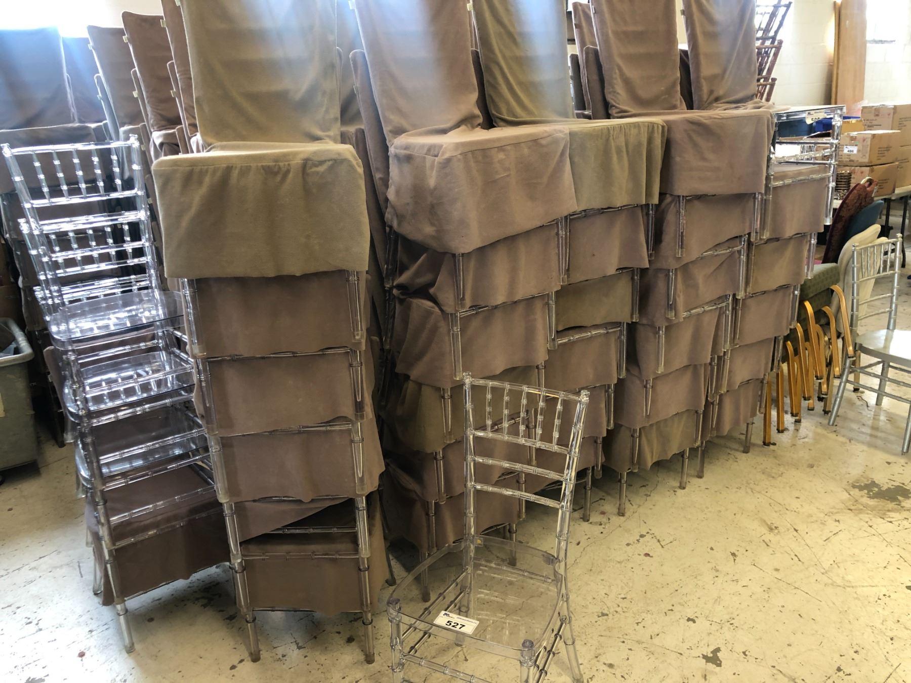 STACK OF 6 COLLAPSIBLE/STACKING EVENT CHAIRS, COMES WITH NON-MATCHING BEIGE/BROWN COVERS