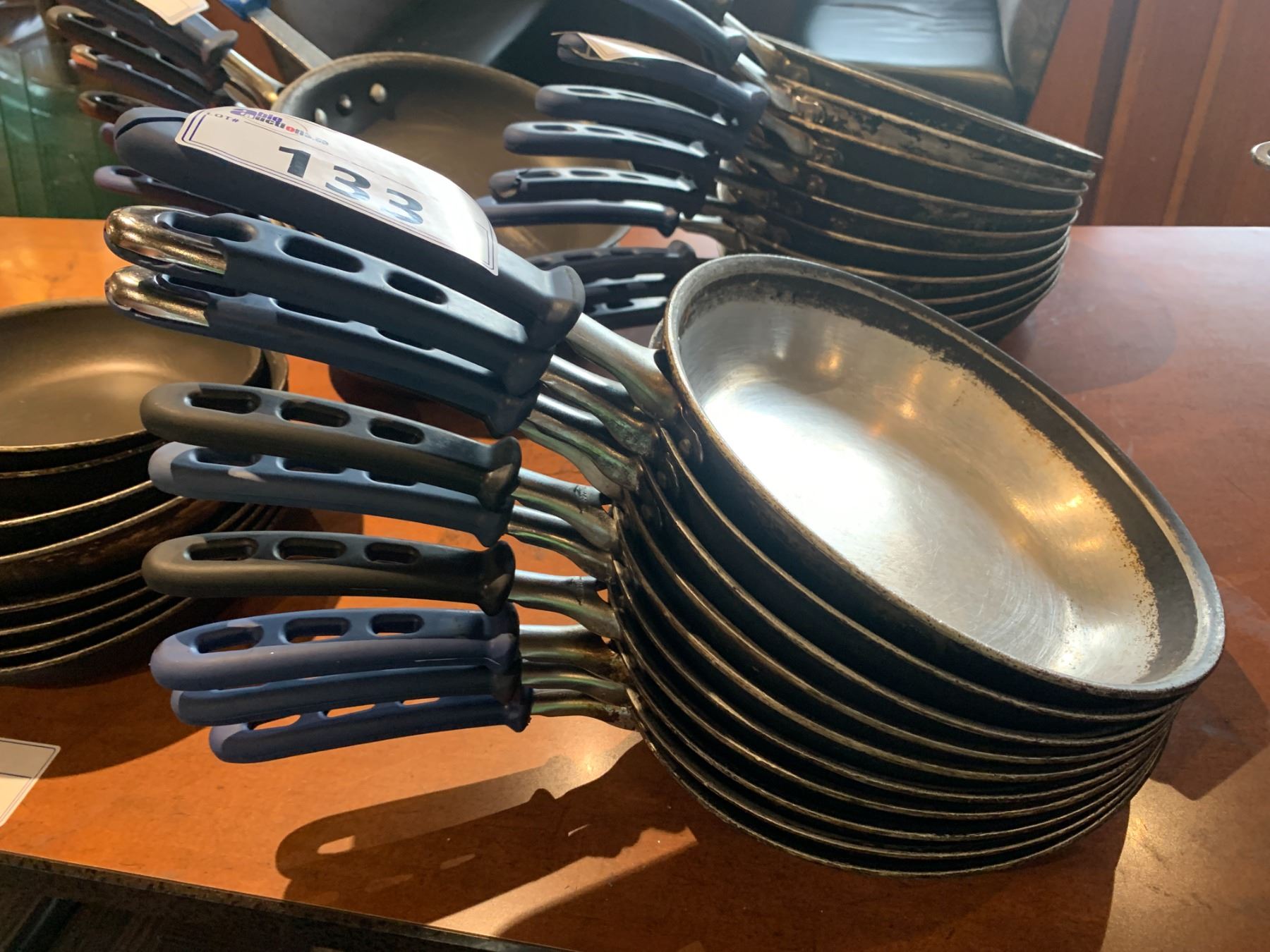 STACK OF 7 ASSORTED COMMERCIAL TEFLON FRYING PANS