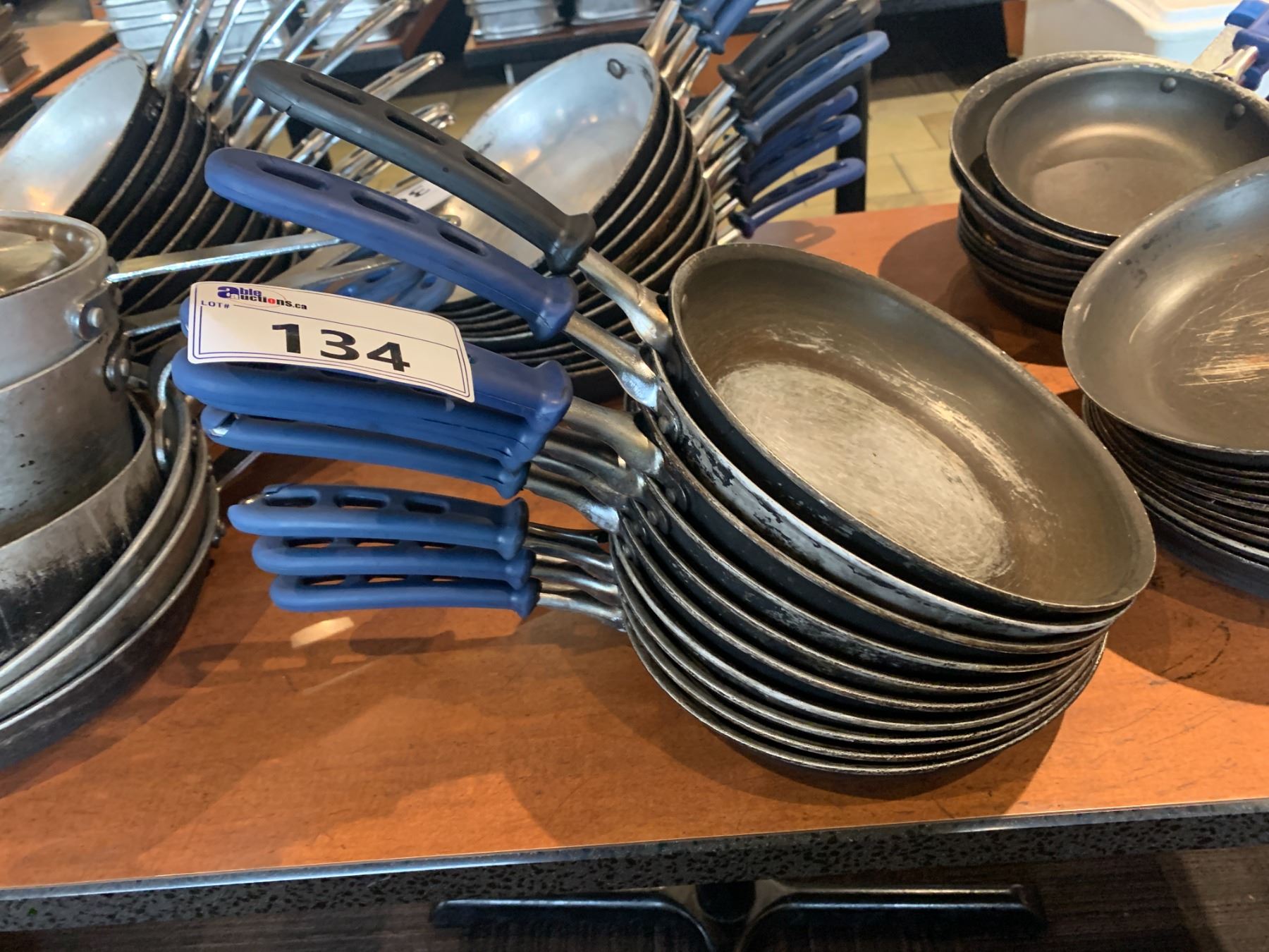 STACK OF 7 ASSORTED COMMERCIAL TEFLON FRYING PANS