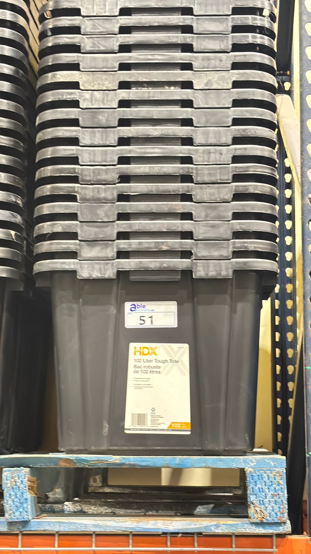 STACK OF APPROX. 40 BLACK PLASTIC STORAGE BINS WITH SOME LIDS