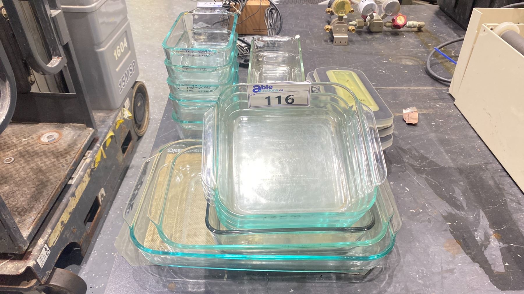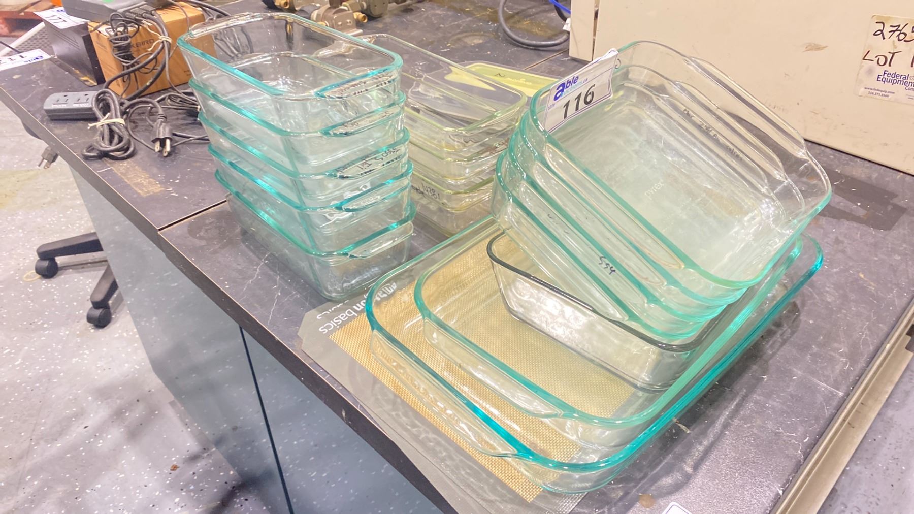 STACK OF ASSORTED SIZE PYREX CLEAR GLASS LABORATORY DISHES WITH SOME LIDS