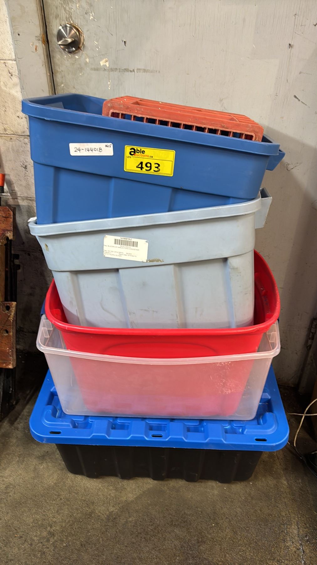 STACK OF ASSORTED TOTES & 1 MILK CRATE - ONE WITH A LID