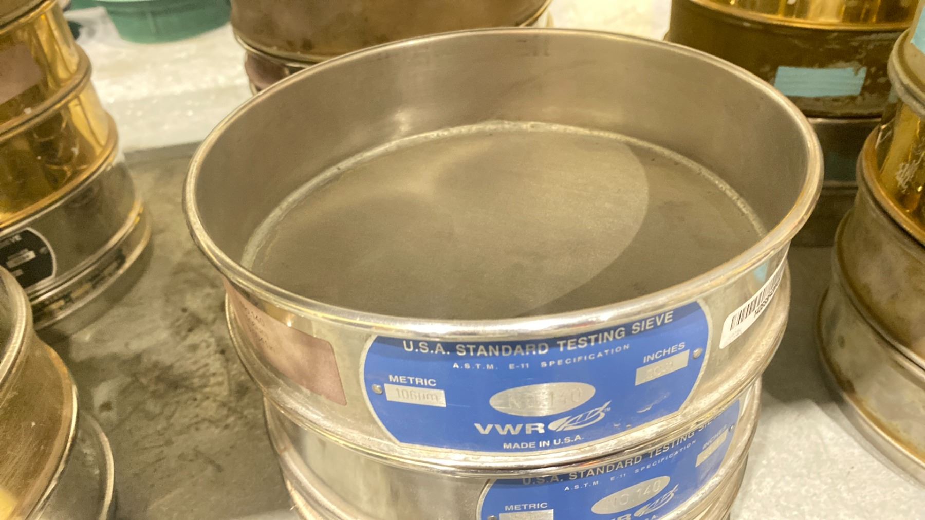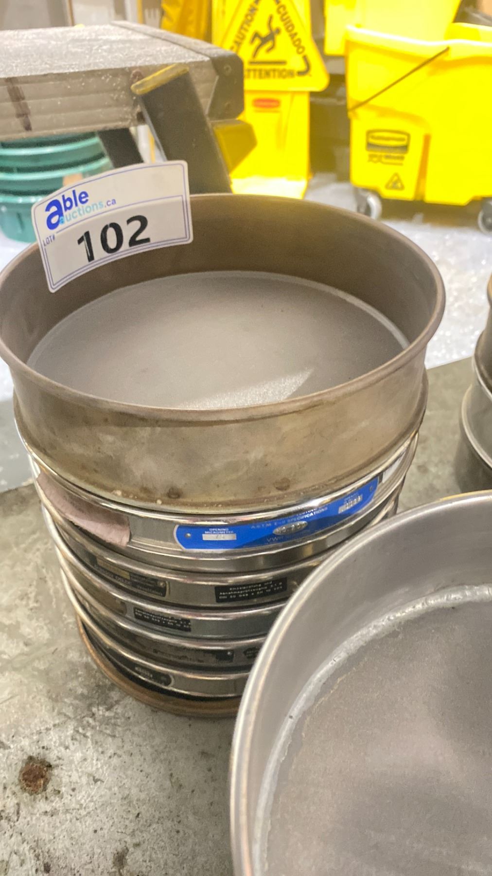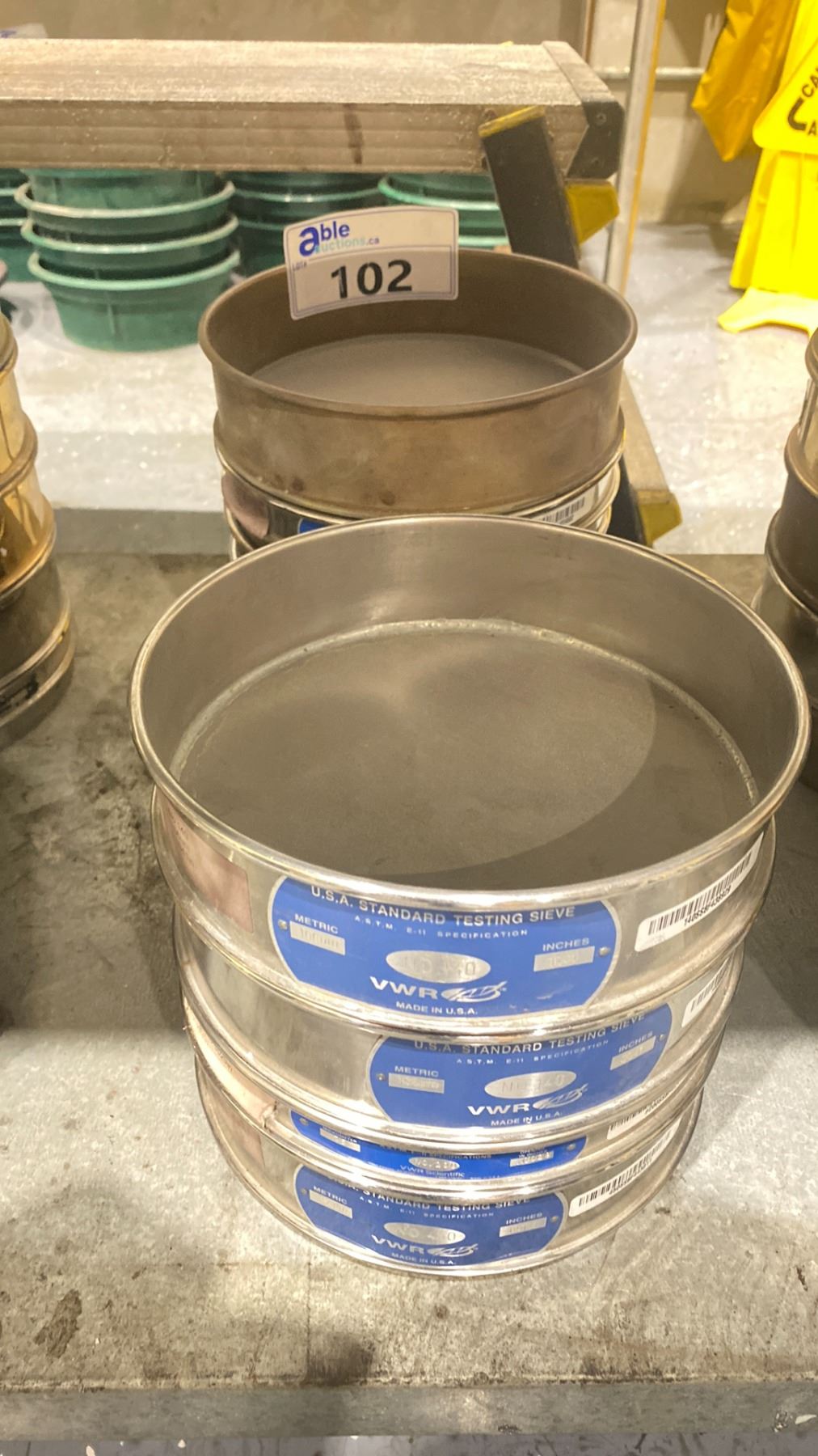 STACK OF COMMERCIAL LABORATORY TEST SIEVES IN ASSORTED SIZES NO 140 - 450