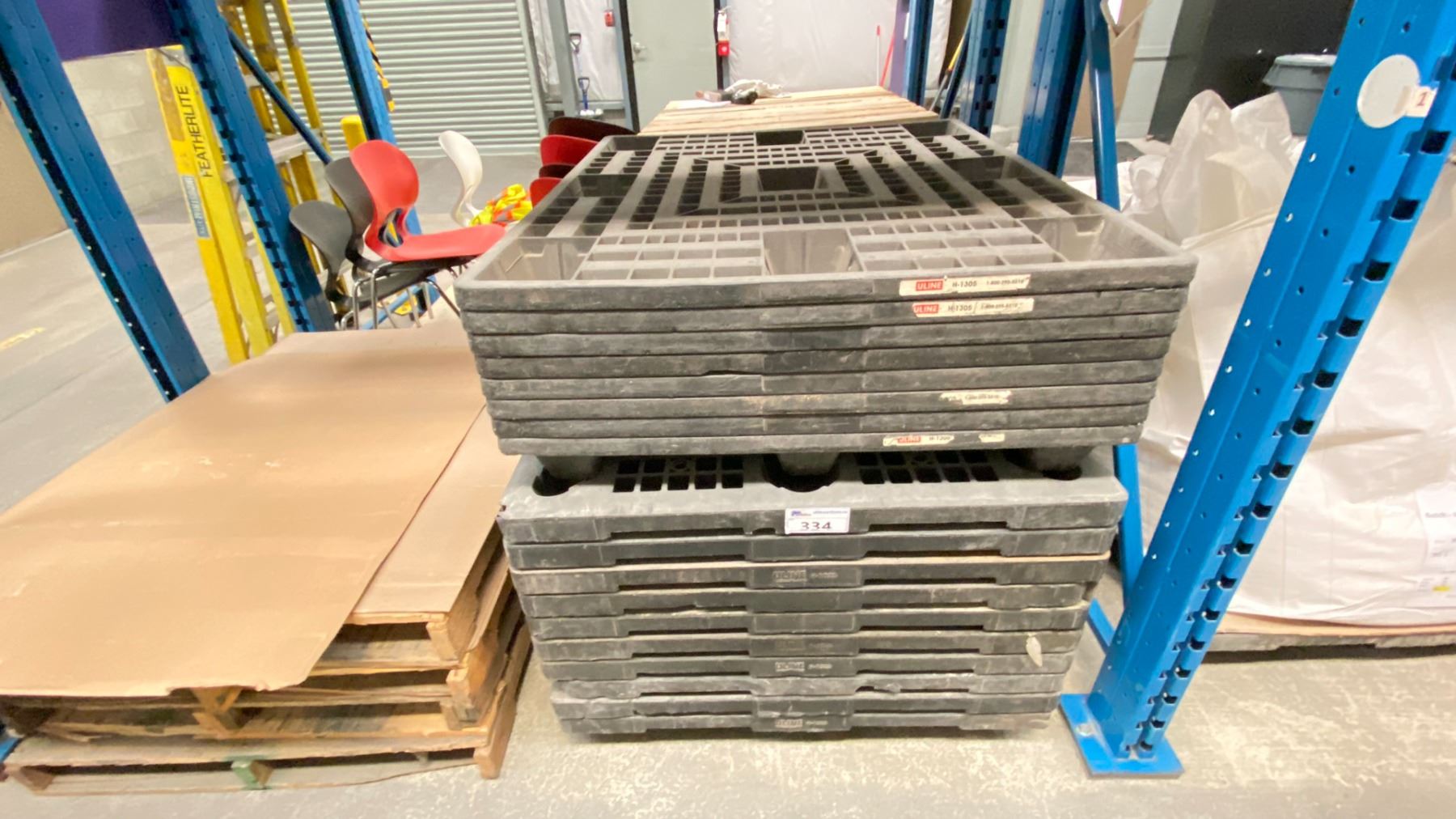 STACK OF ULINE PLASTIC PALLETS. APPROX 18 MODELS H-1305 AND H-1023. 40X48"