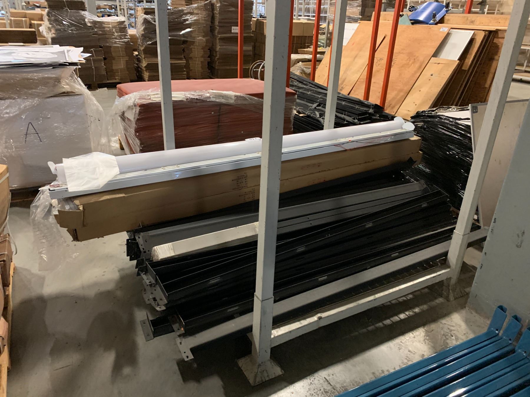 STACKABLE 4' X 4' PRODUCT STORAGE CRATE WITH CONTENTS OF ASSORTED SHELVING CROSS BEAMS AND LED LIGHT BARS