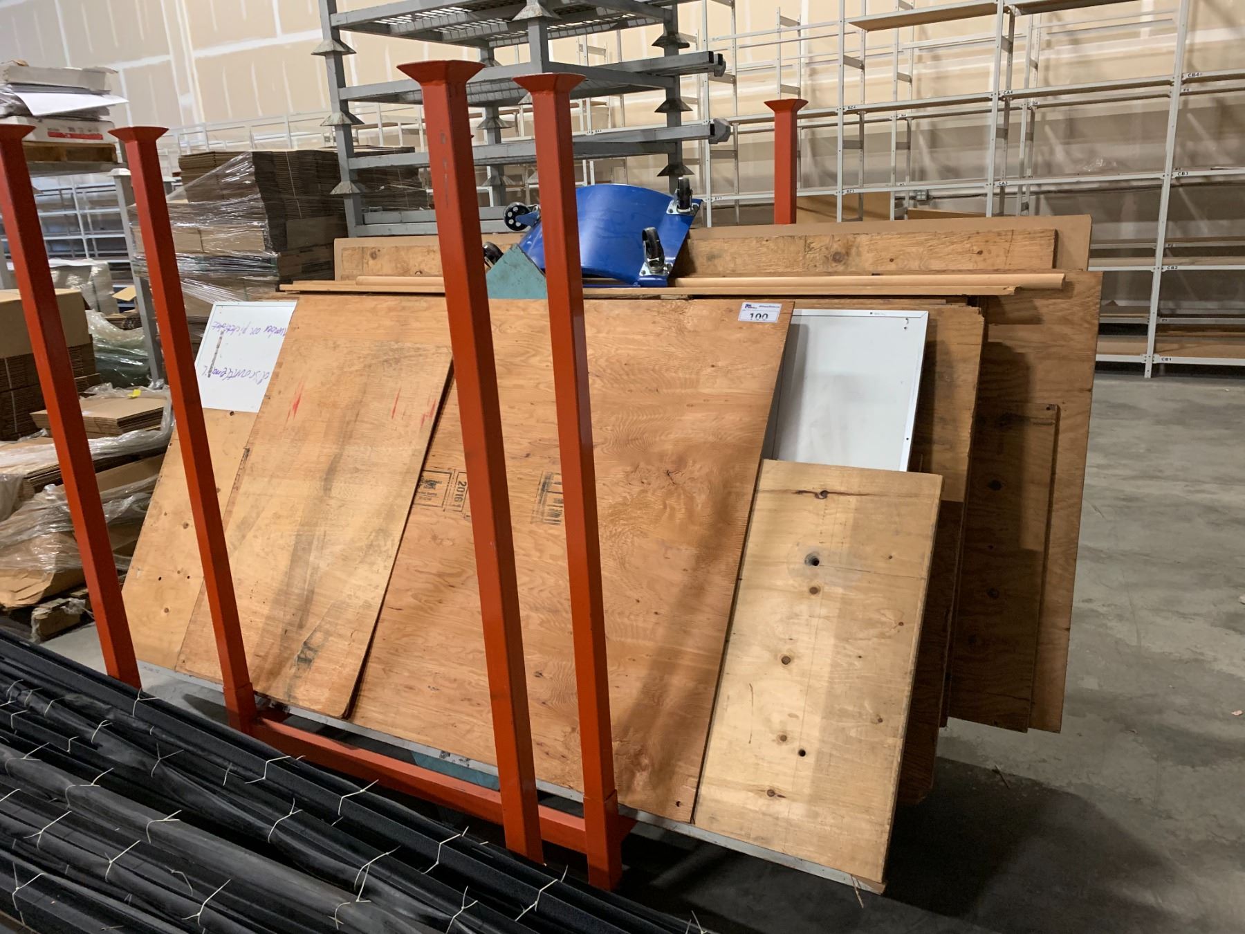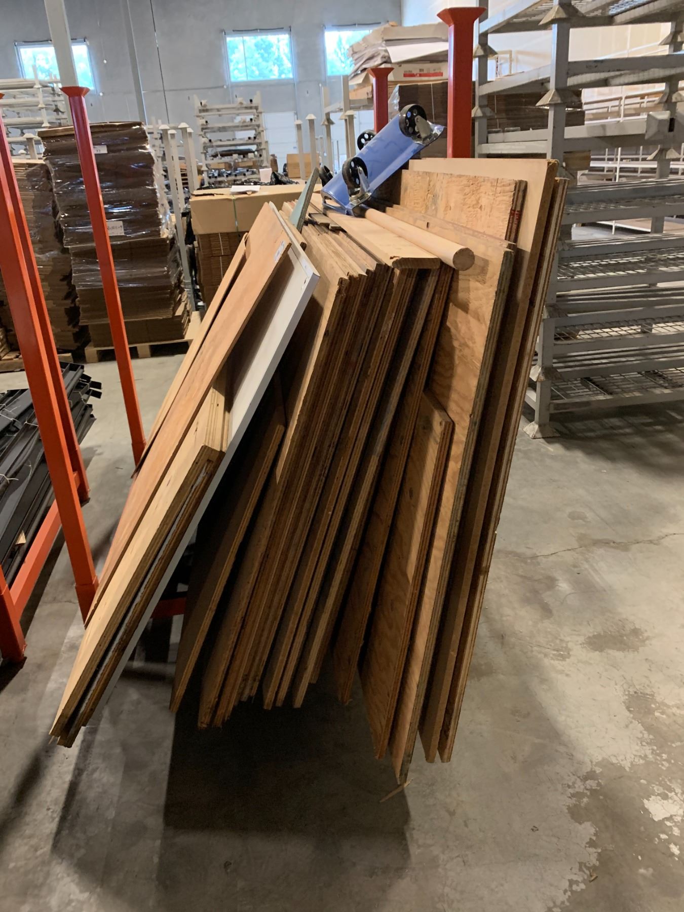 STACKABLE 4' X 4' PRODUCT STORAGE CRATE WITH CONTENTS OF ASSORTED SIZE PLYWOOD, WHITEBOARD AND TIRE DOLLY