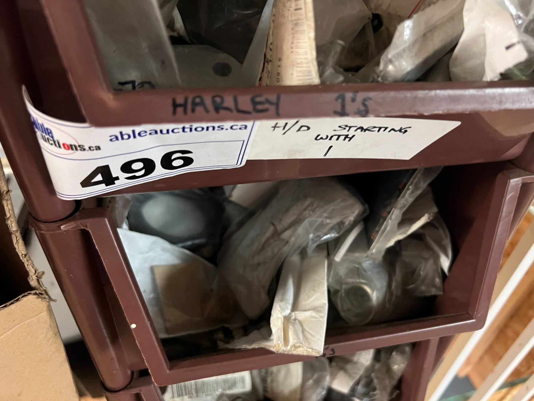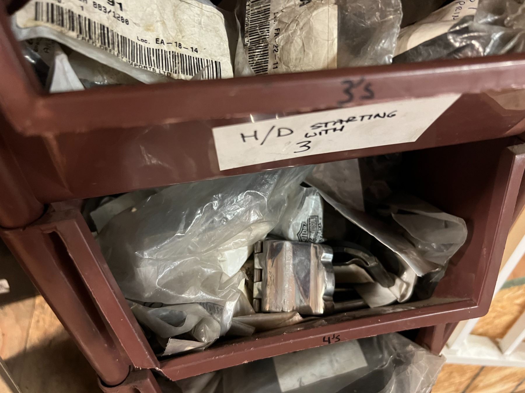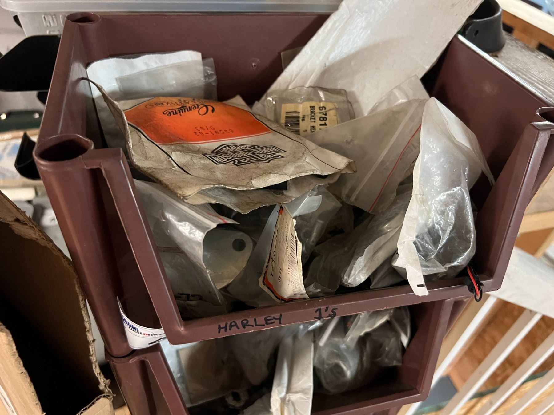 STACKING BINS WITH HARLEY-DAVIDSON FASTENERS, PLATES, SEAT SPRINGS, BRACKETS ETC (BINS INCLUDED) &