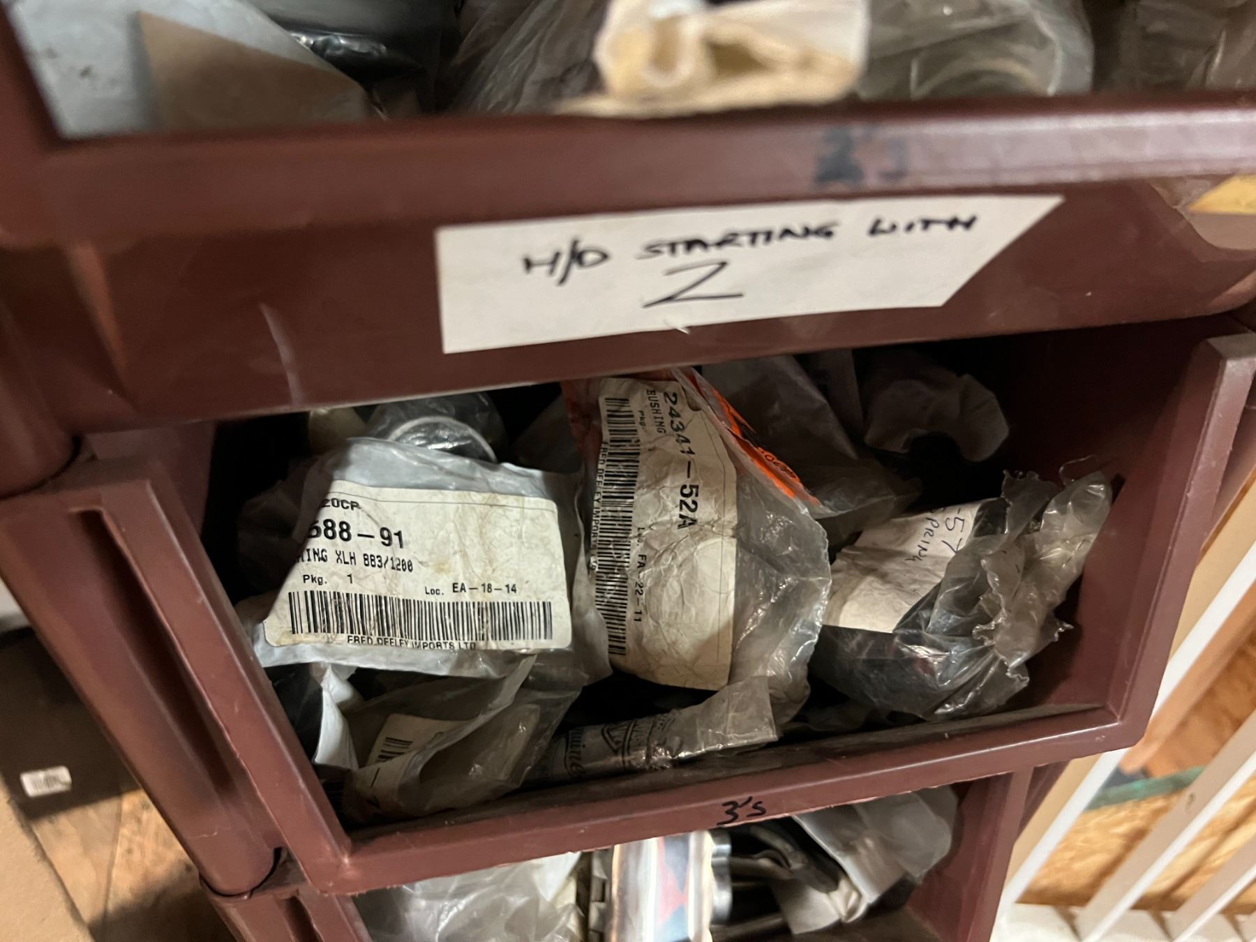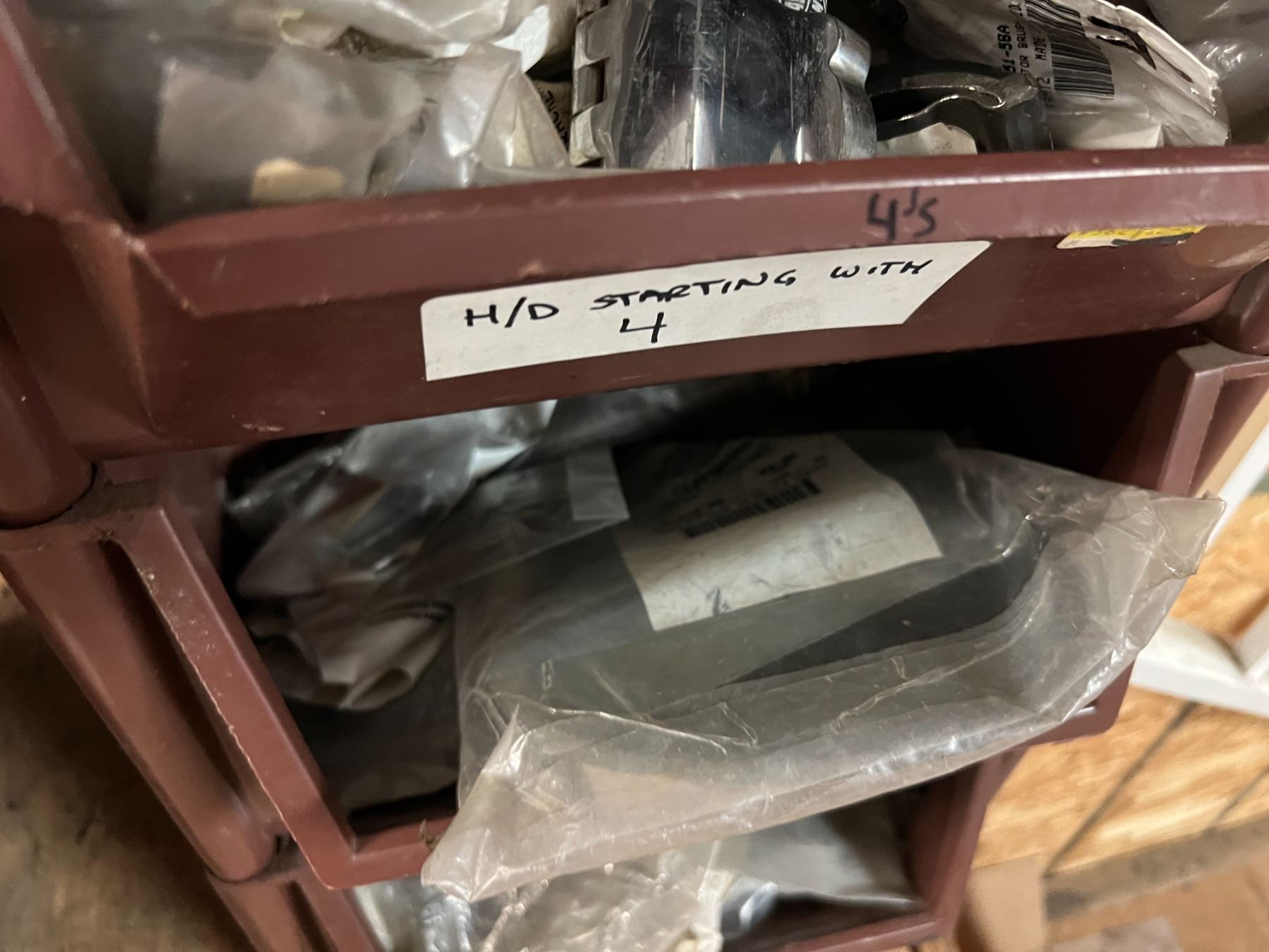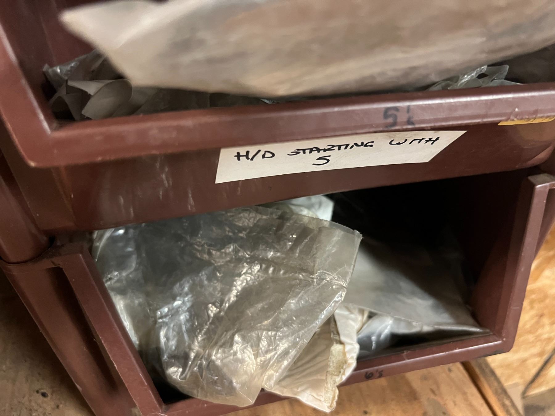 STACKING BINS WITH HARLEY-DAVIDSON FASTENERS, PLATES, SEAT SPRINGS, BRACKETS ETC (BINS INCLUDED) &
