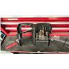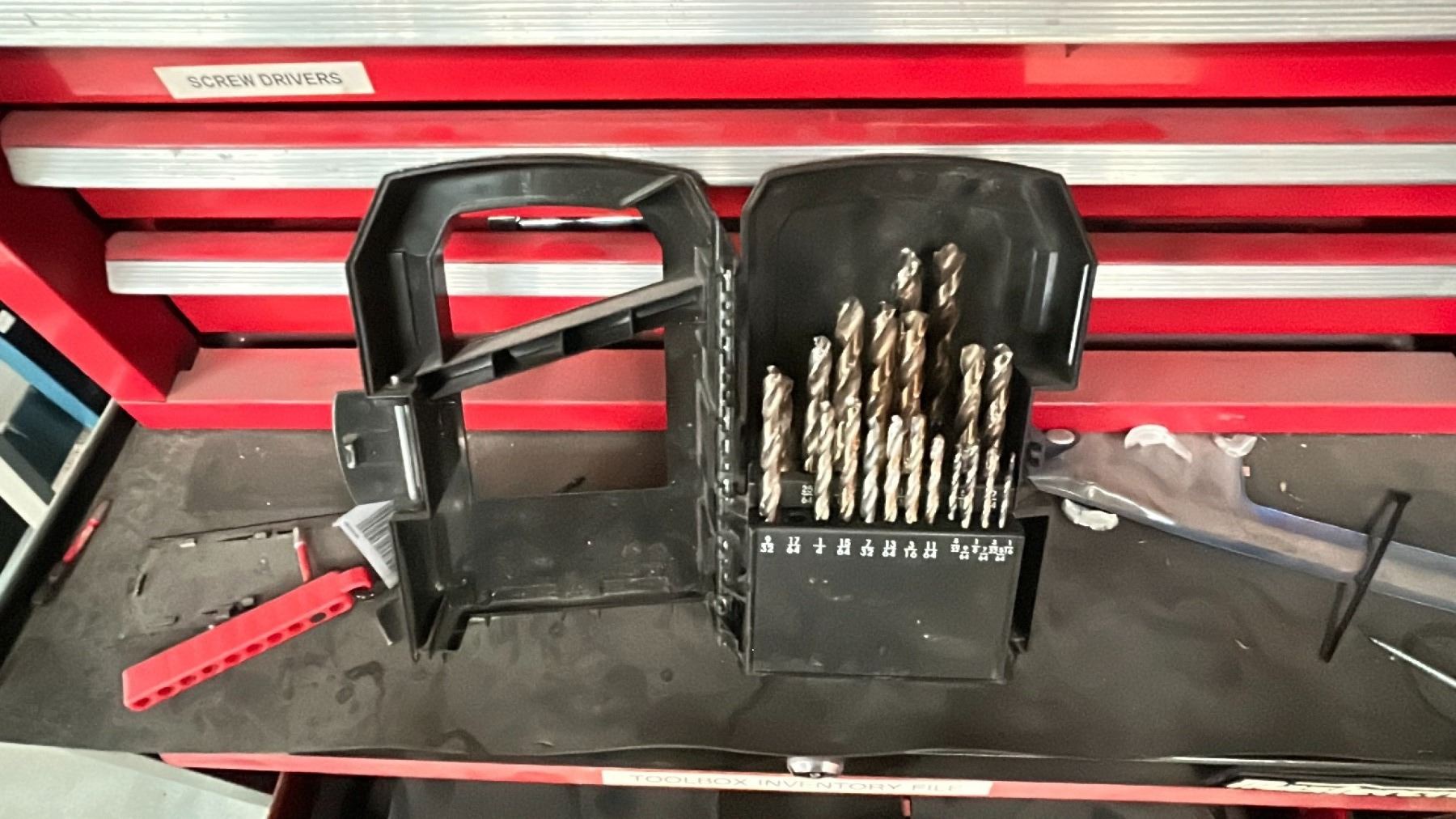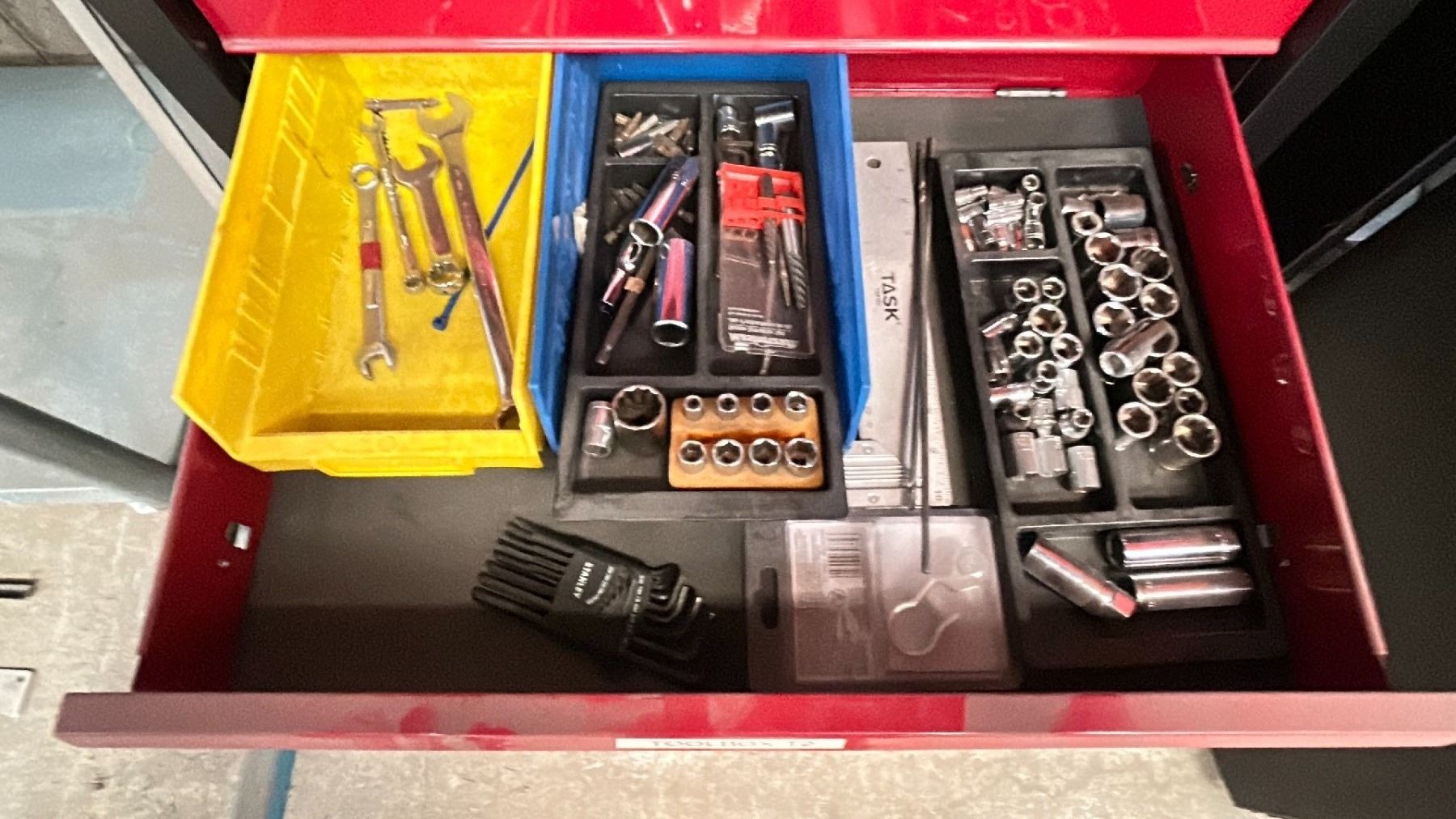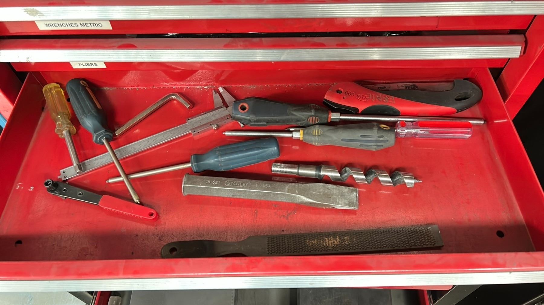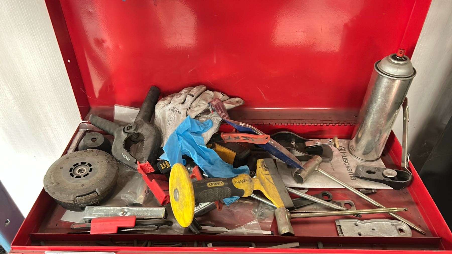 STACKING TOOL BOXES WITH CONTENTS. LG ASST TOOLS, CHISELS, COMBINATION WRENCHES, SCREWDRIVERS, DRILL BITS, ALAN KEYS, SOLDERING GUN, SOCKETS GALORE, RIVET GUN AND RIVETS, HAMMERS, C-CLIP TOOLS, ETC ON WHEELS