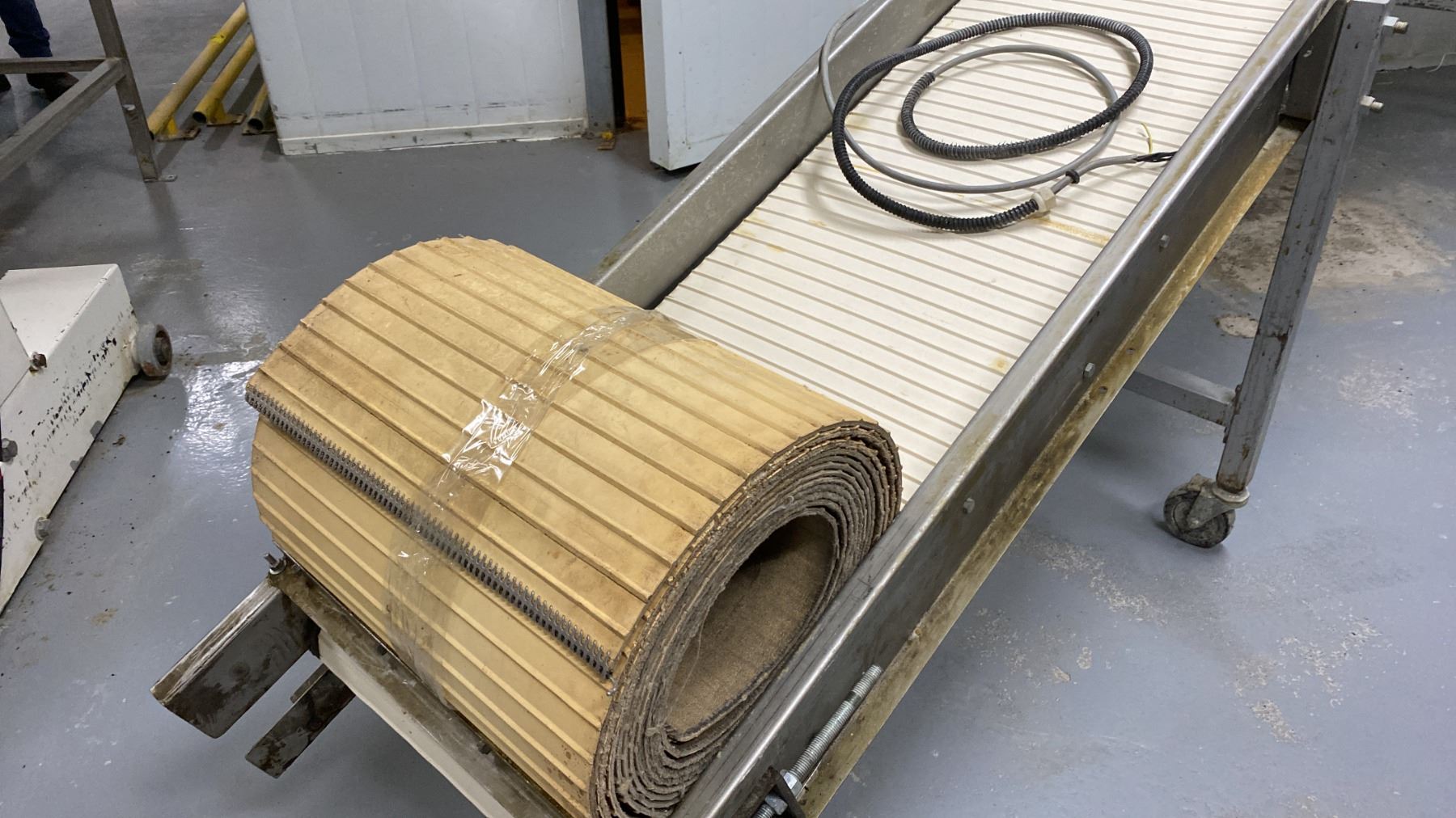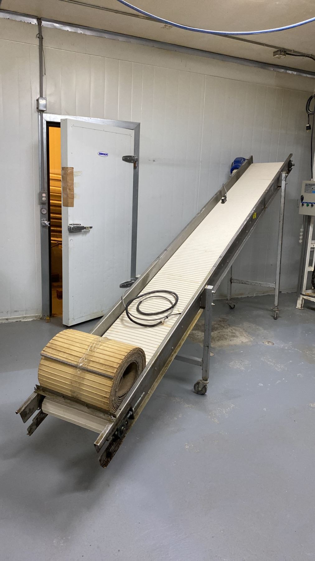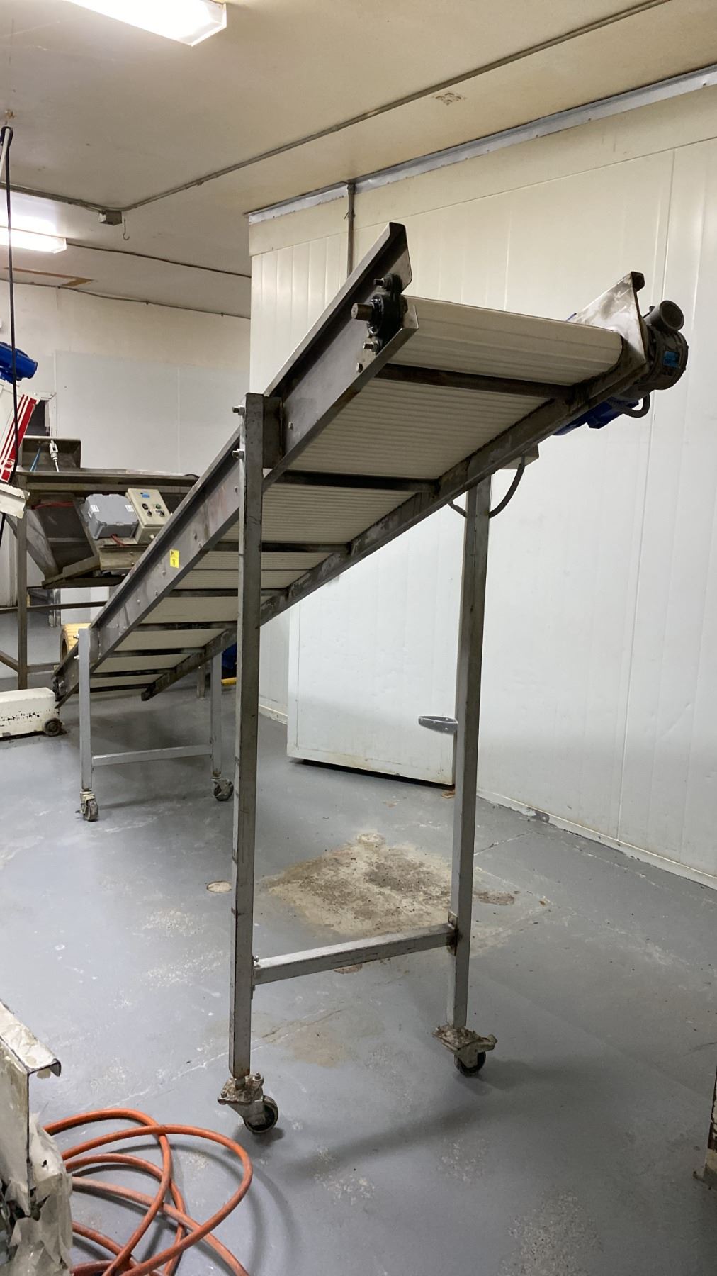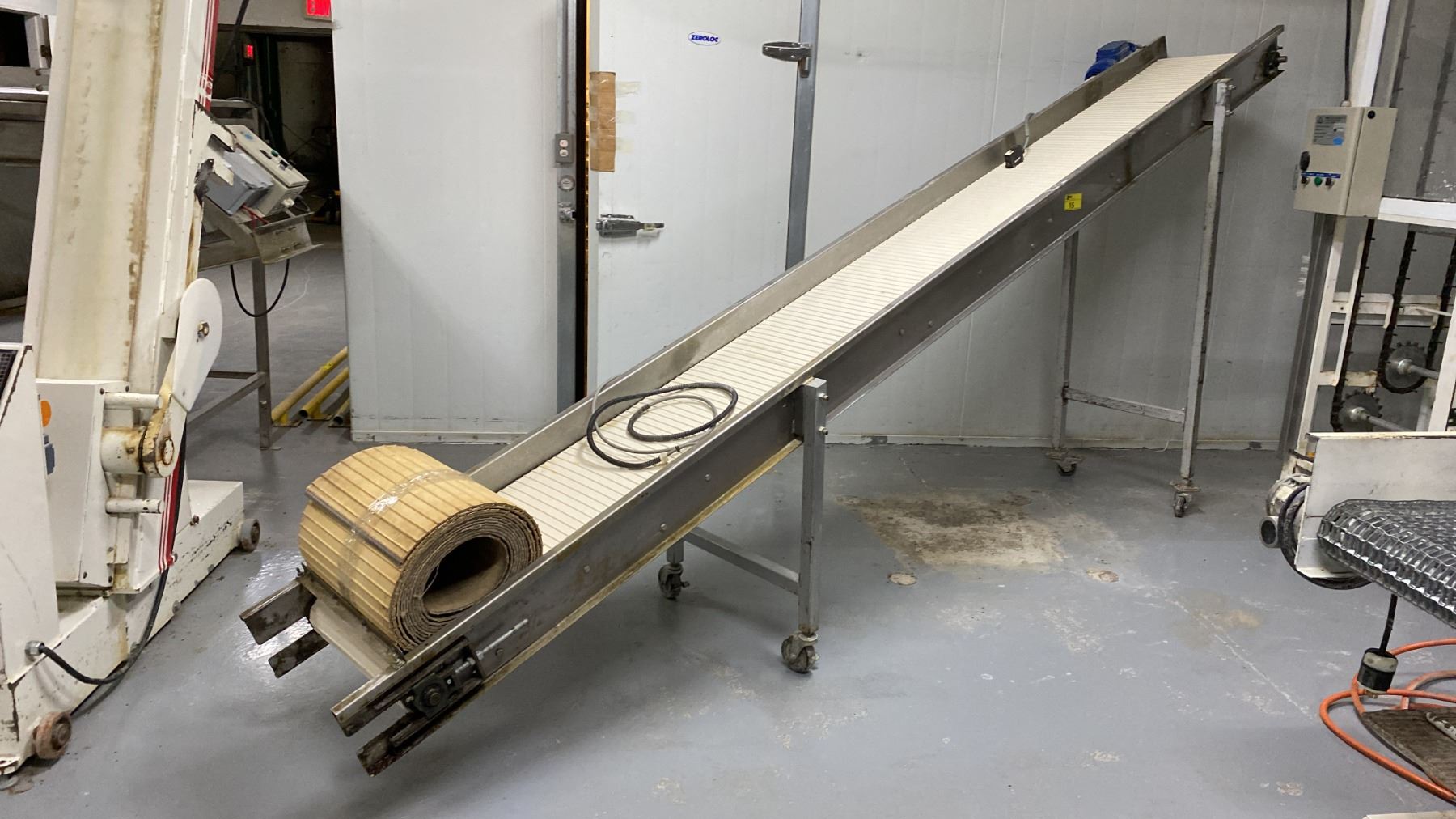 STAINLESS STEEL 18"W X 160"L X 76"H COMMERCIAL MOBILE POWERED FEEDER CONVEYOR SYSTEM WITH SECOND RUBBER CONVEYOR BELT