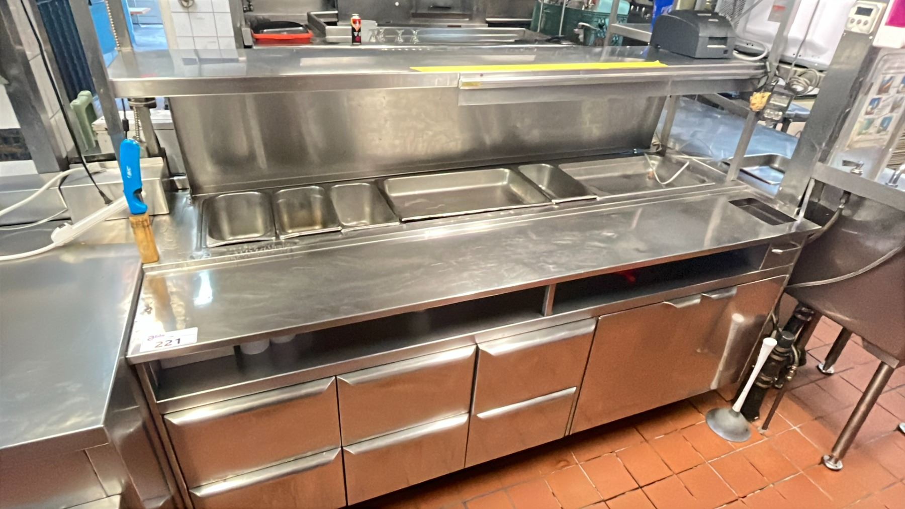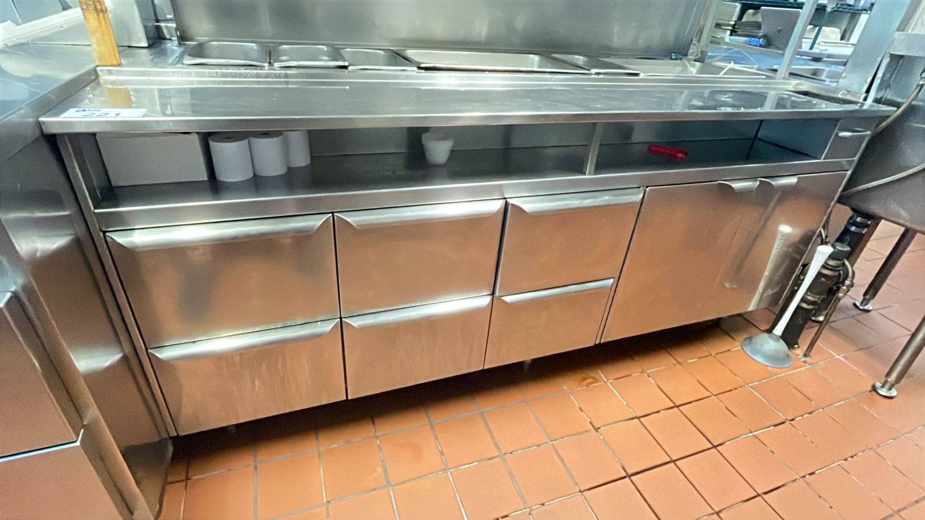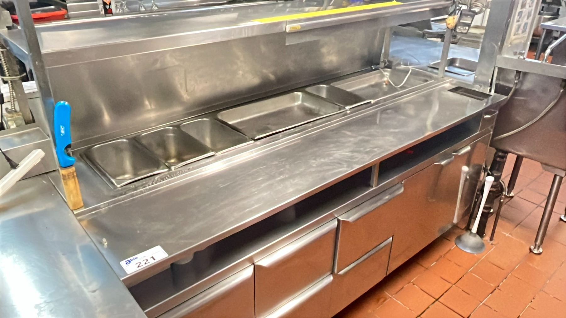 STAINLESS STEEL 7 DRAWER 2 DOOR COOLER PREP TABLE WITH METAL SHELVING ABOVE AND GLO RAY FOOD WARMER