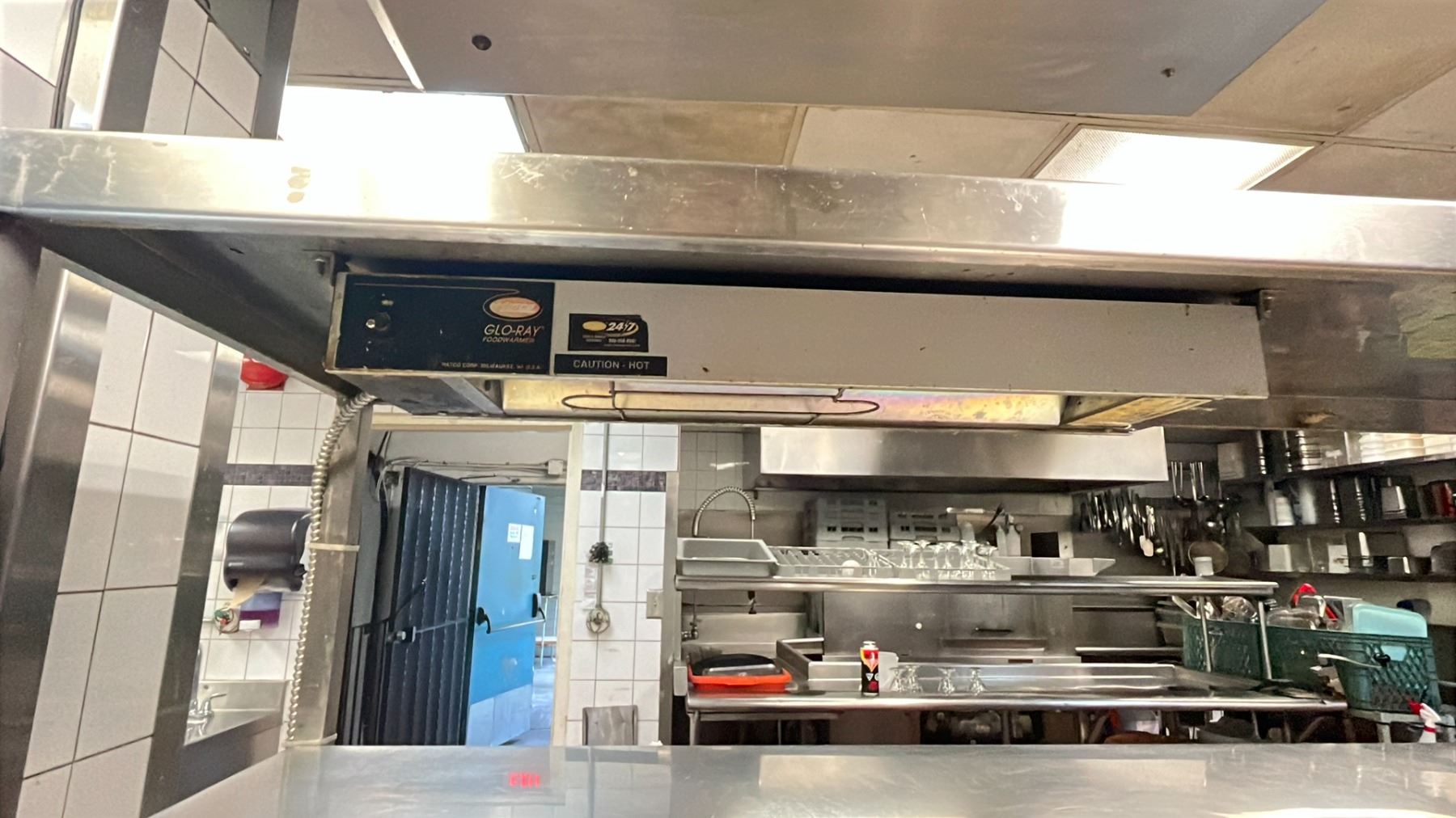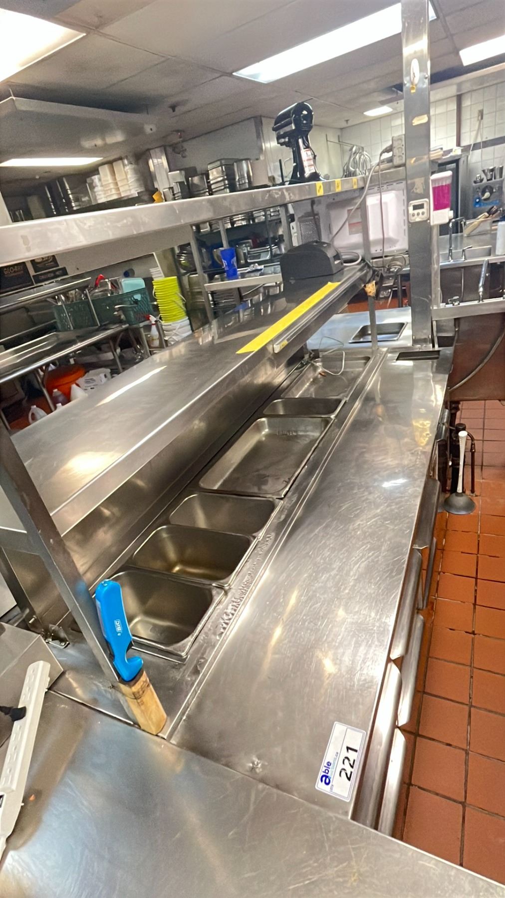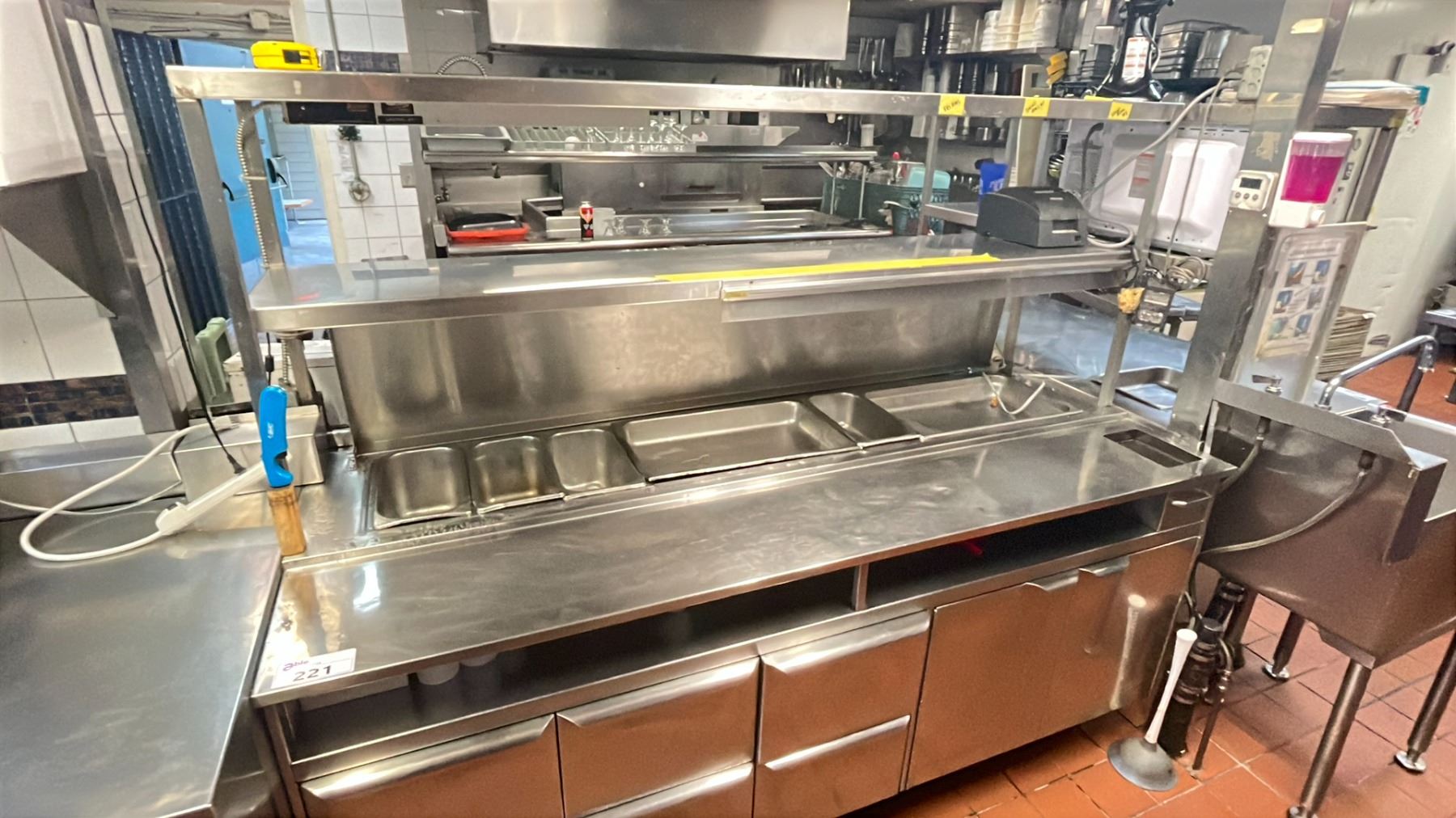 STAINLESS STEEL 7 DRAWER 2 DOOR COOLER PREP TABLE WITH METAL SHELVING ABOVE AND GLO RAY FOOD WARMER