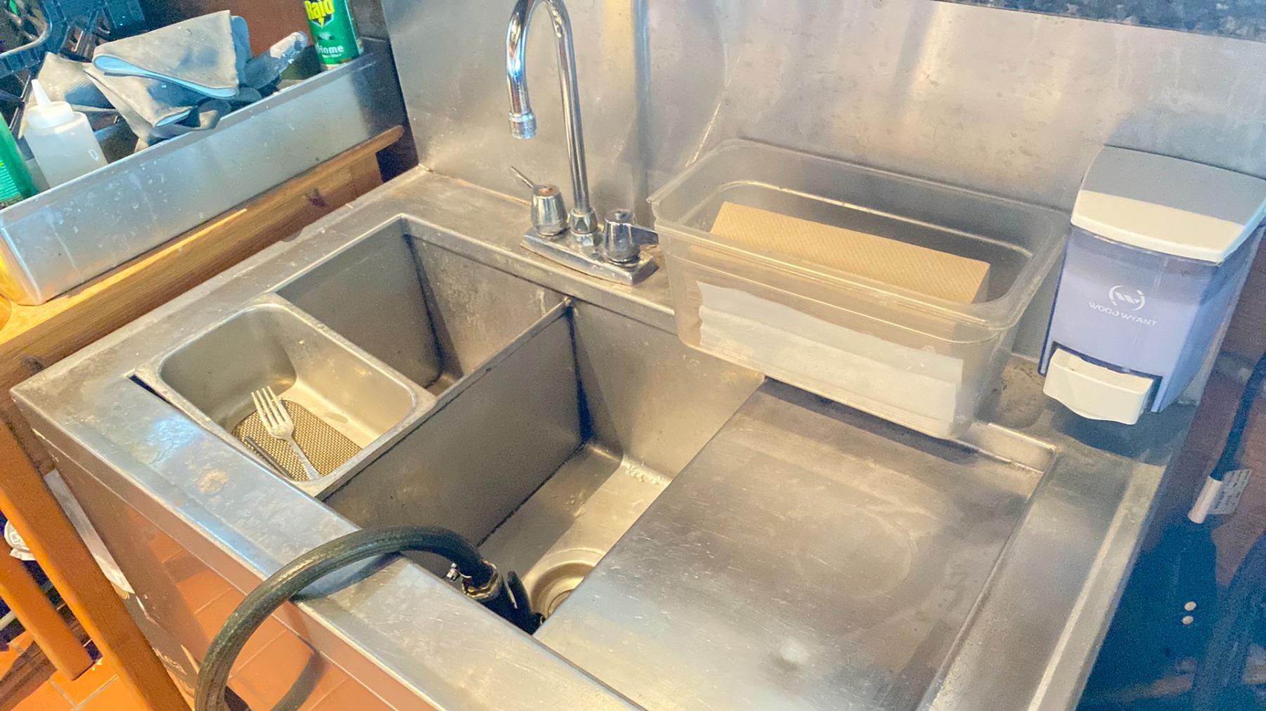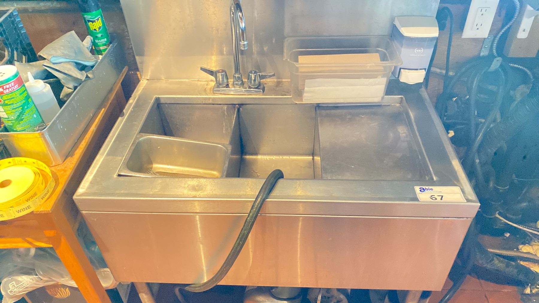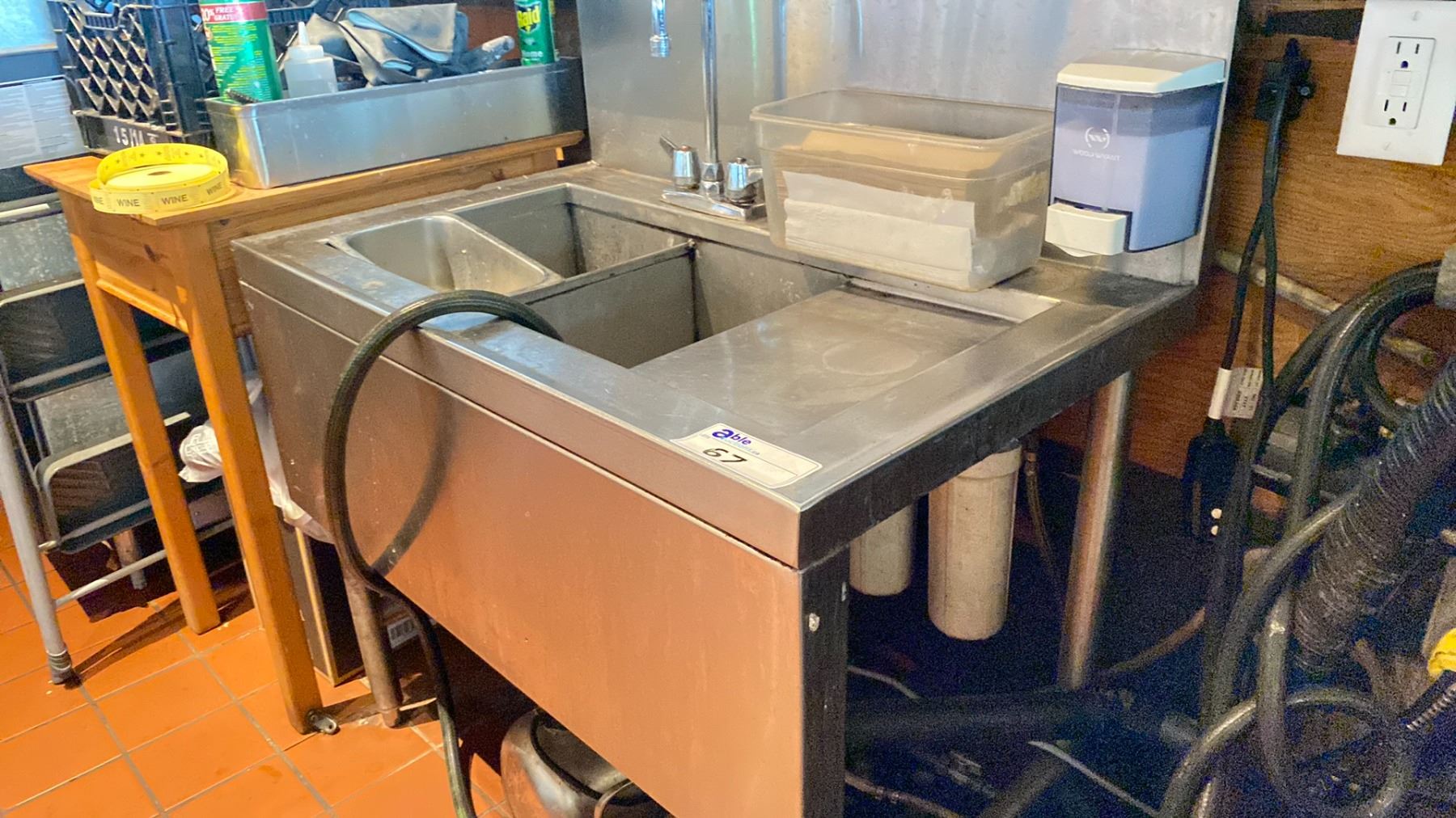 STAINLESS STEEL BAR SINK AND TUB WITH HOT COLD FAUCET AND DRAIN APPROX 36" L X 22" W X 40" H