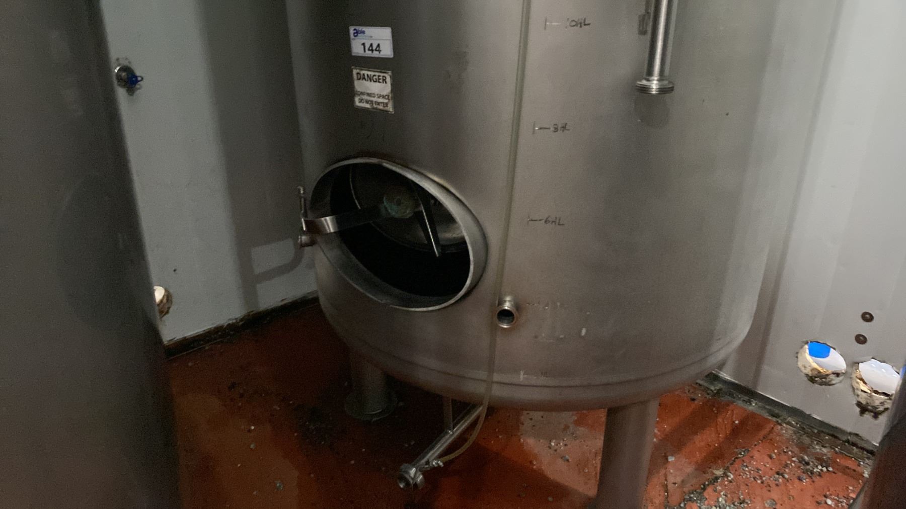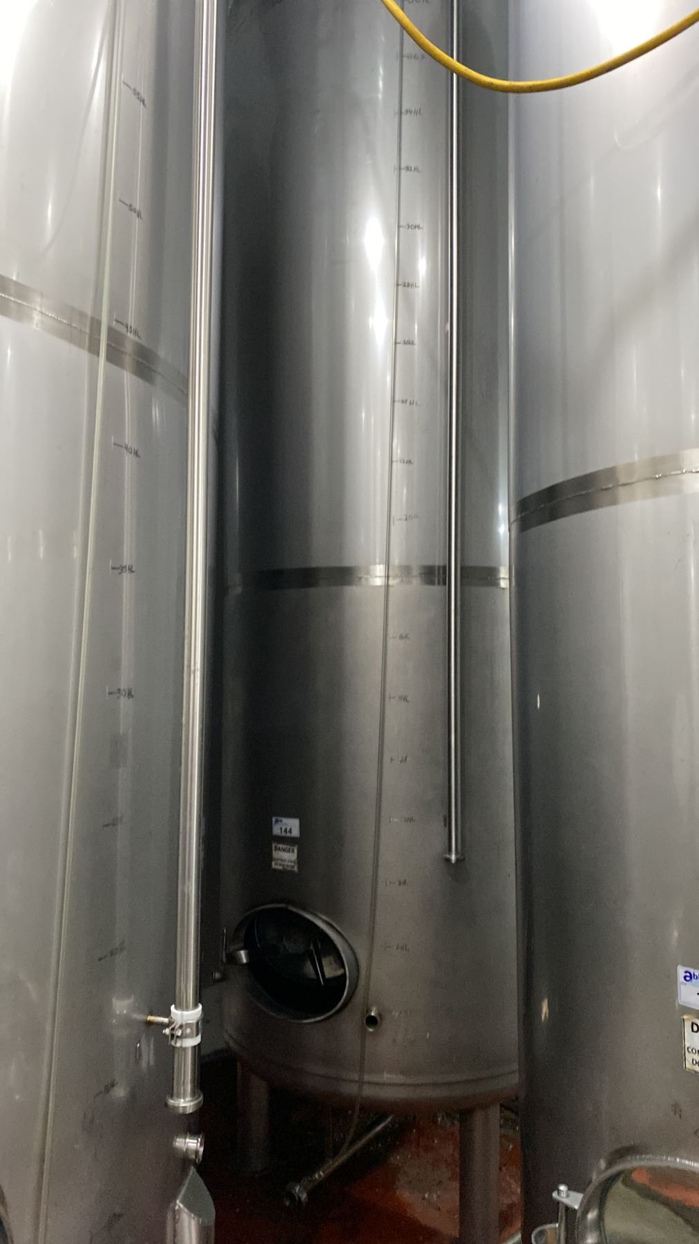 STAINLESS STEEL BRITE TANK MODEL-20 HECTOLITER - APPROX 4'D X 13'H FEET *BUYER WILL REQUIRE ANY TOOLS/EQUIPMENT AND HELP NECESSARY FOR REMOVAL* *REQUIRES HIAB/CRANE FOR REMOVAL*
