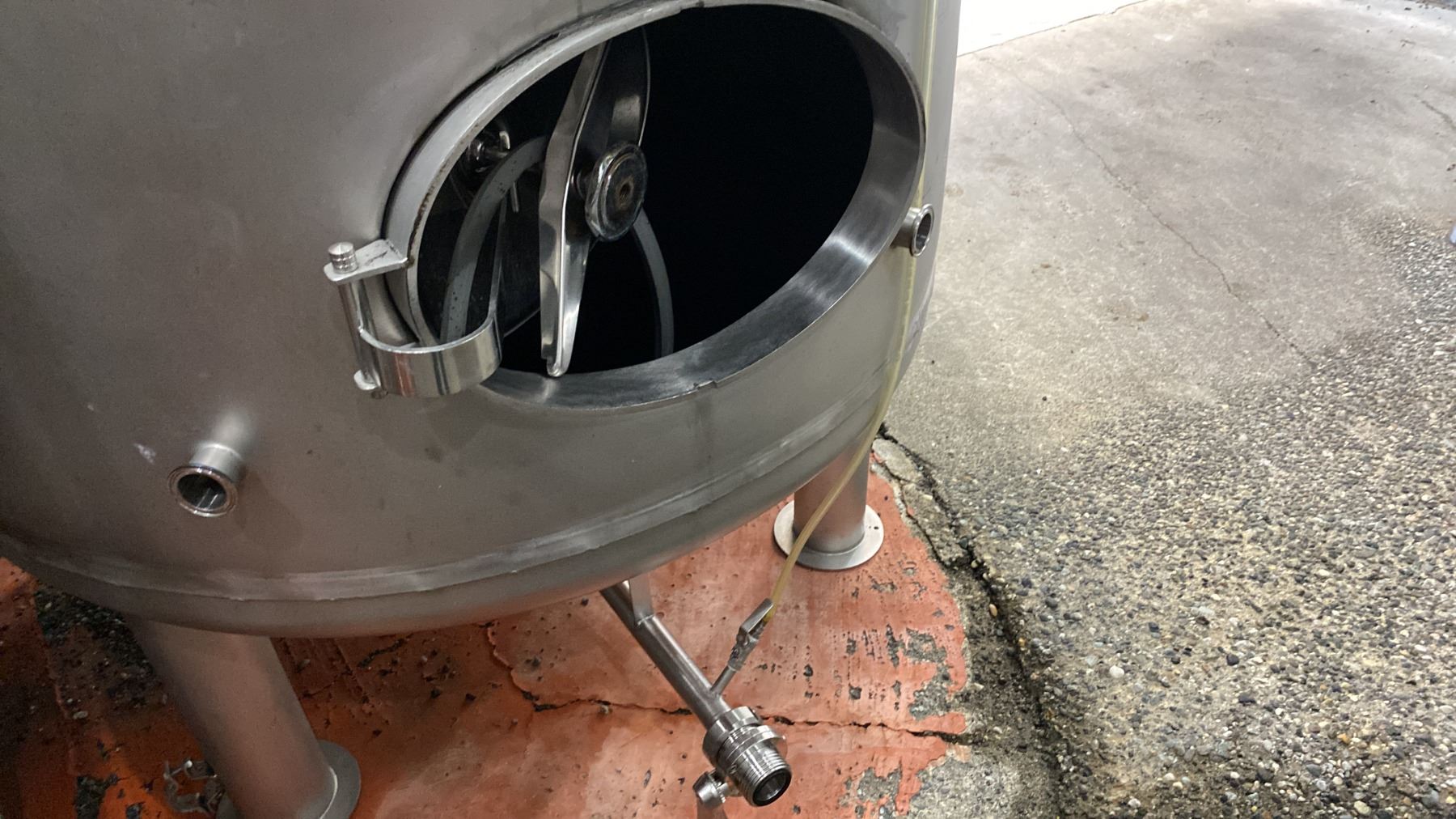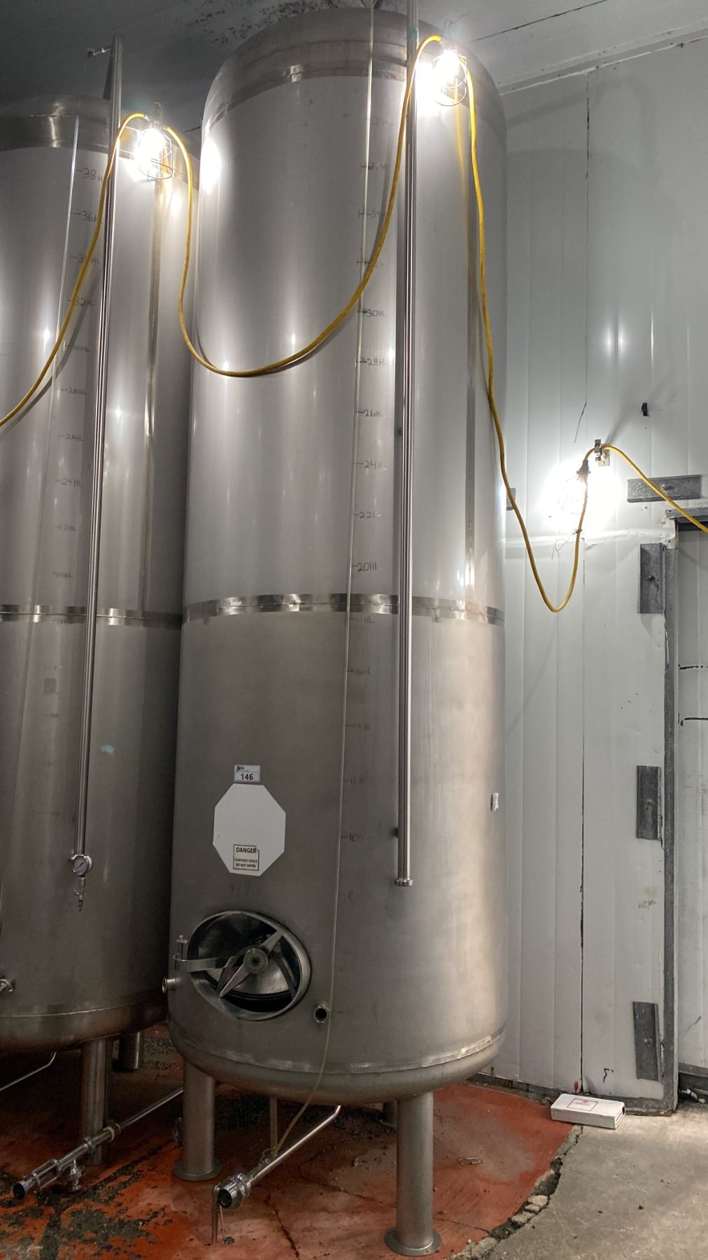 STAINLESS STEEL BRITE TANK MODEL-20 HECTOLITER - APPROX 4'D X 13'H FEET *BUYER WILL REQUIRE ANY TOOLS/EQUIPMENT AND HELP NECESSARY FOR REMOVAL* *REQUIRES HIAB/CRANE FOR REMOVAL*