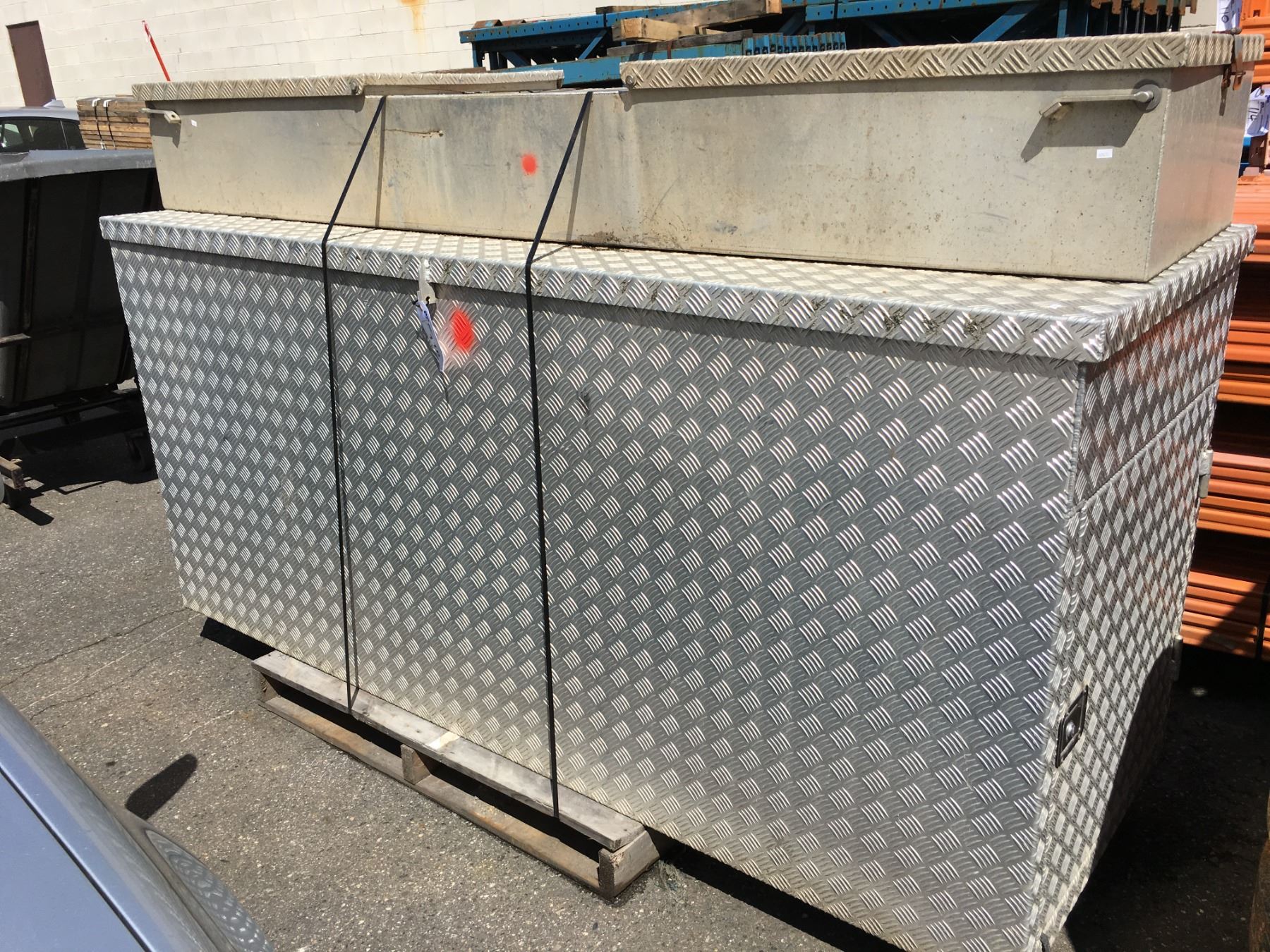 STAINLESS STEEL CHECKER PLATE CUSTOM CONSTRUCTION STORAGE BOX WITH 2 SIDE DOORS AND TOP LOAD 94"L X 34"W X 42"H