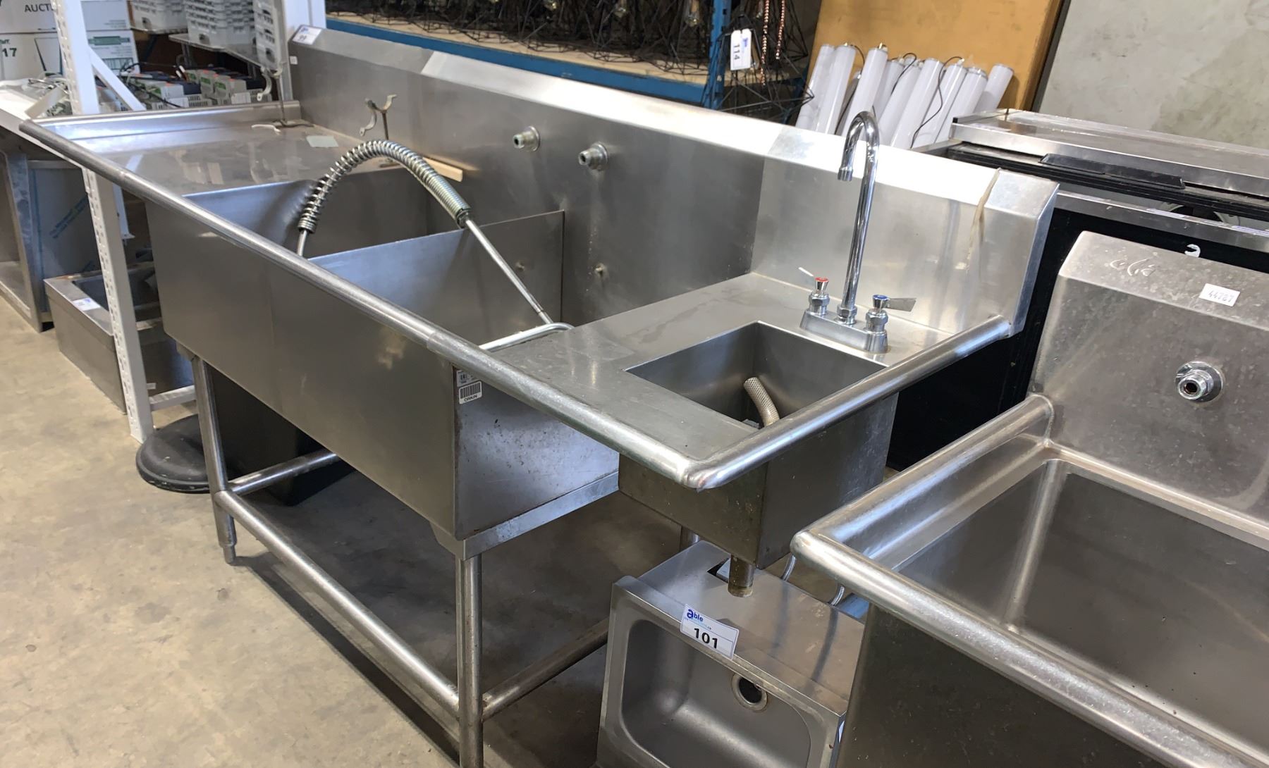 STAINLESS STEEL COMMERCIAL 2 BAY PREPARATION SINK WITH RINSE WAND & HAND WASH STATION - APPROX. 84"W X 30"D X 45"H