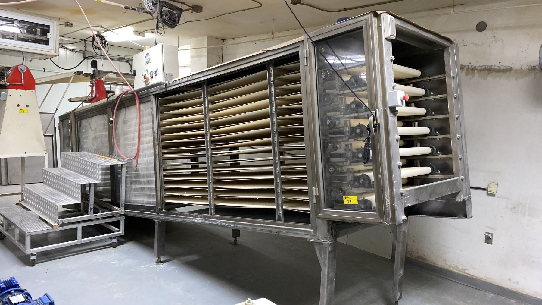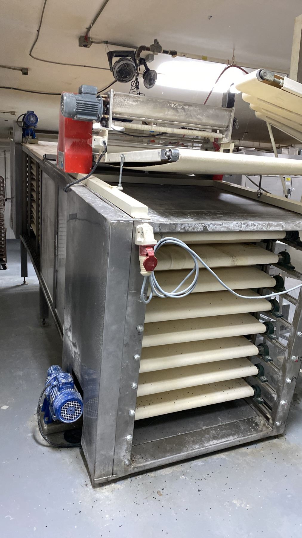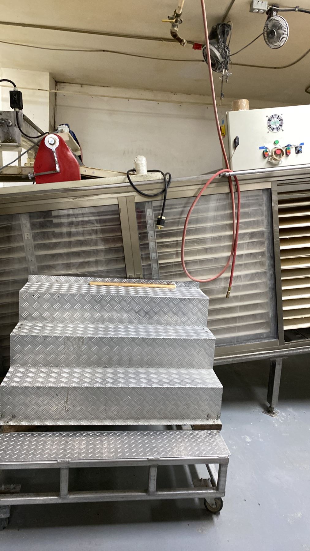 STAINLESS STEEL COMMERCIAL RUBBER CONVEYOR 15 BAY POWERED OVEN LOADING SYSTEM WITH PRI-4 COMMERCIAL ROUNDER FLATTING MACHINE & CHECKER PLATE MOBILE ACCESS STAIRS
