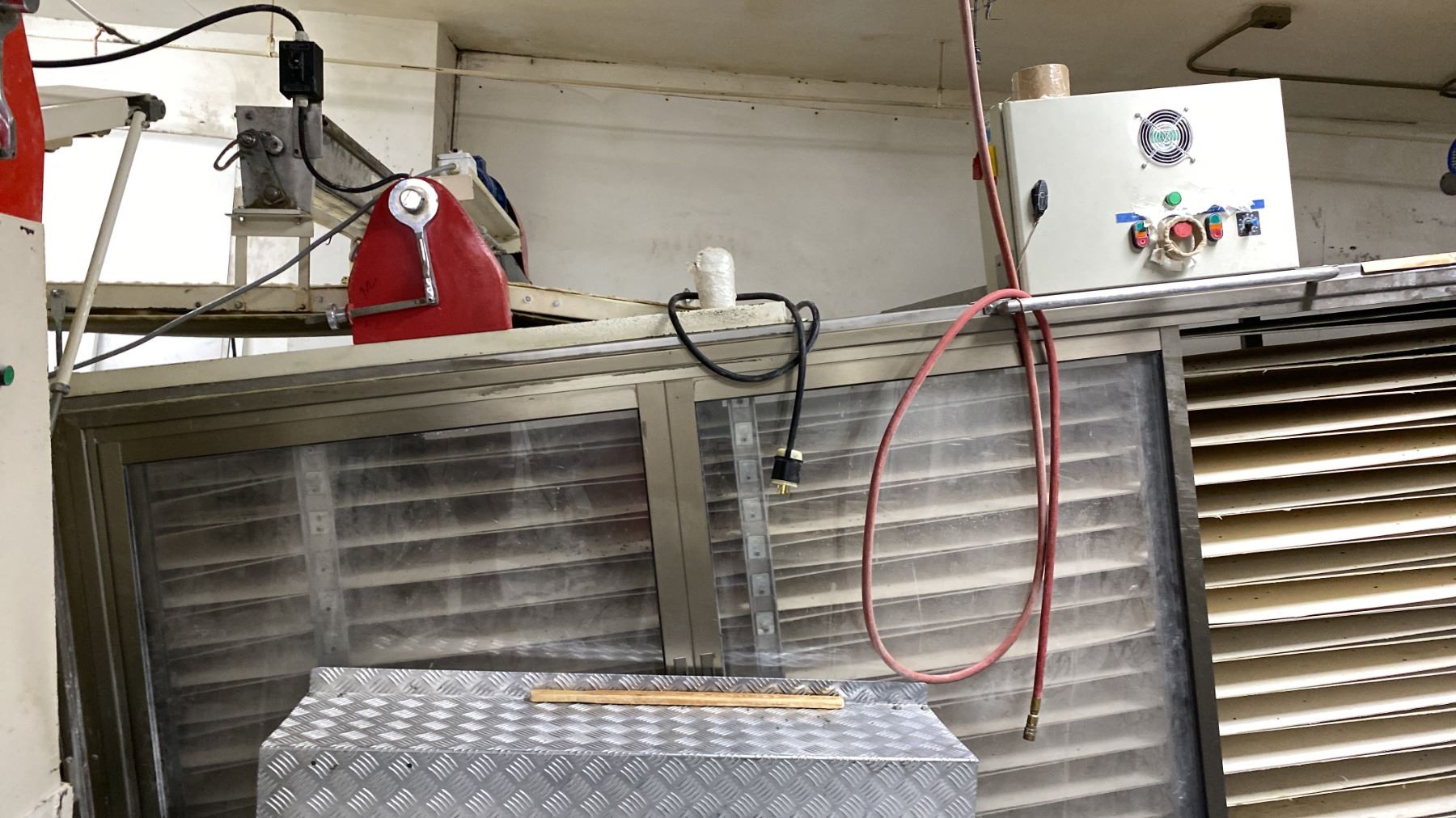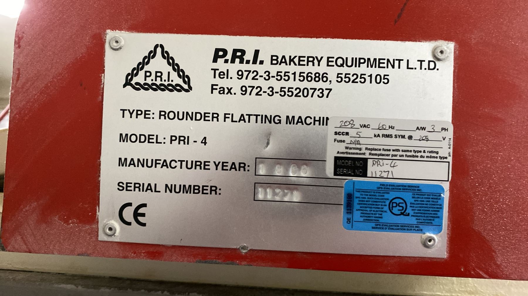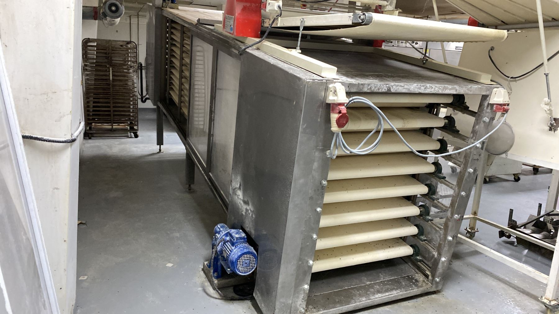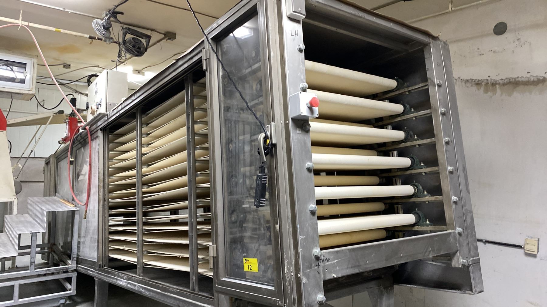 STAINLESS STEEL COMMERCIAL RUBBER CONVEYOR 15 BAY POWERED OVEN LOADING SYSTEM WITH PRI-4 COMMERCIAL ROUNDER FLATTING MACHINE & CHECKER PLATE MOBILE ACCESS STAIRS