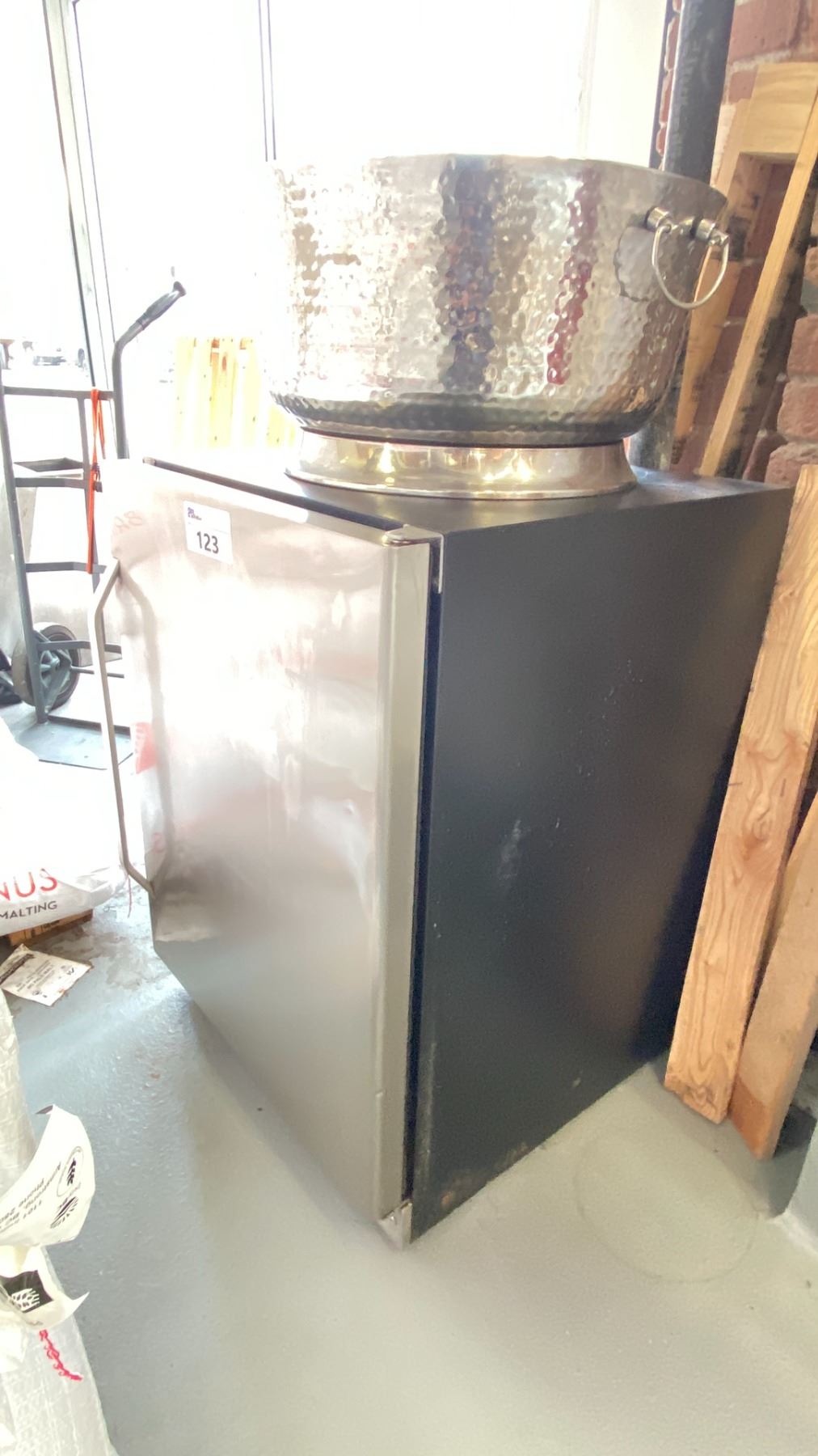 STAINLESS STEEL ELECTRIC BAR REFRIGERATOR WITH ASSORTED STAINLESS STEEL ICE BUCKETS / BOWLS *FIRST DAY REMOVAL*
