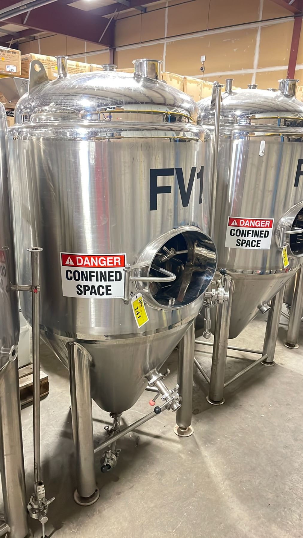 STAINLESS STEEL JACKETED CONE BOTTOM COMMERCIAL BREWERY FERMENTATION TANK W/FRONT ACCESS ON TRI-LEGS HAS ASSORTED PIPING & GAUGES APPROX 5'H & 2.8' DIAMETER