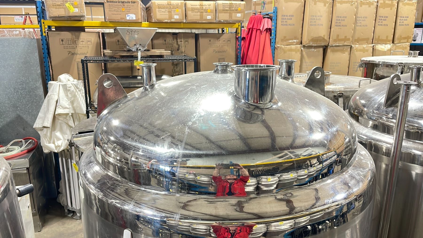 STAINLESS STEEL JACKETED CONE BOTTOM COMMERCIAL BREWERY FERMENTATION TANK W/FRONT ACCESS ON TRI-LEGS HAS ASSORTED PIPING & GAUGES APPROX 5'H & 2.8' DIAMETER