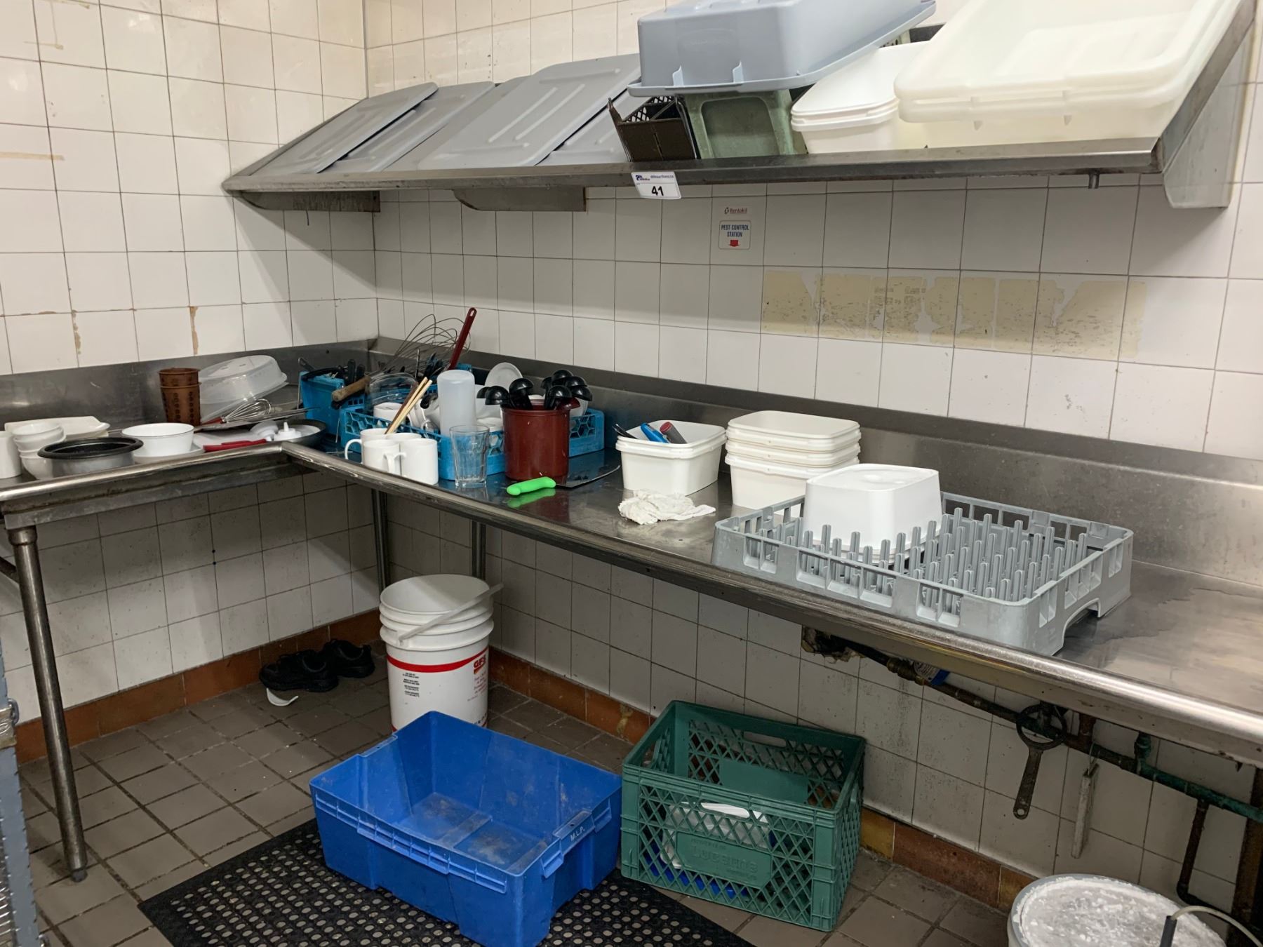 STAINLESS STEEL L SHAPED DISH WASH PREPERATION COUNTER WITH FLOATING UPPER SHELF 28" X 53" X 109" 36"