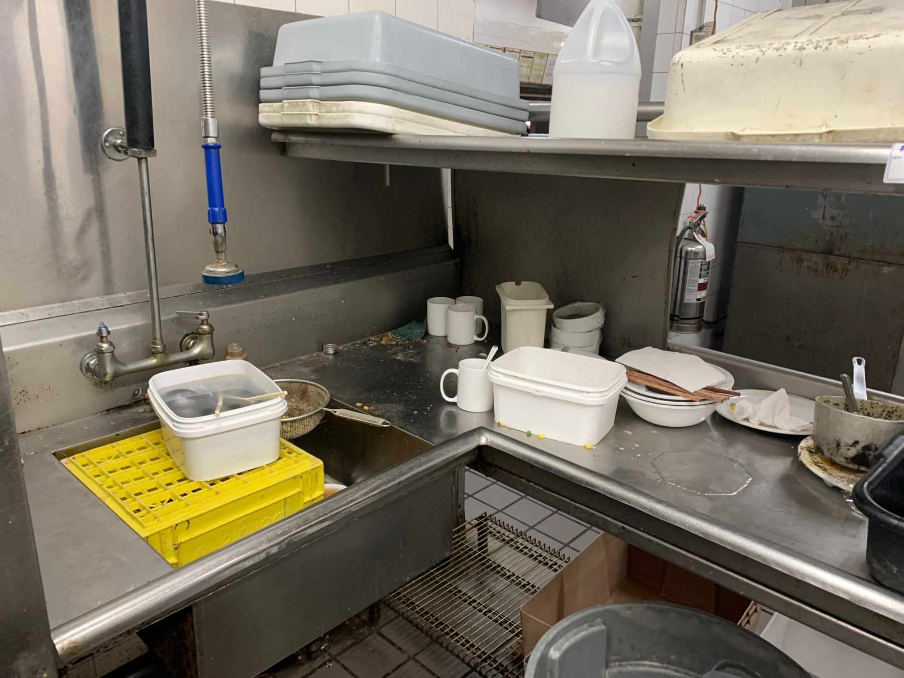 STAINLESS STEEL L SHAPED DISH WASH PREPERATION COUNTER WITH SINGLE SINK, SPRAY FAUCET & UPPER SHELF 31" X 55" X 93" X 37"