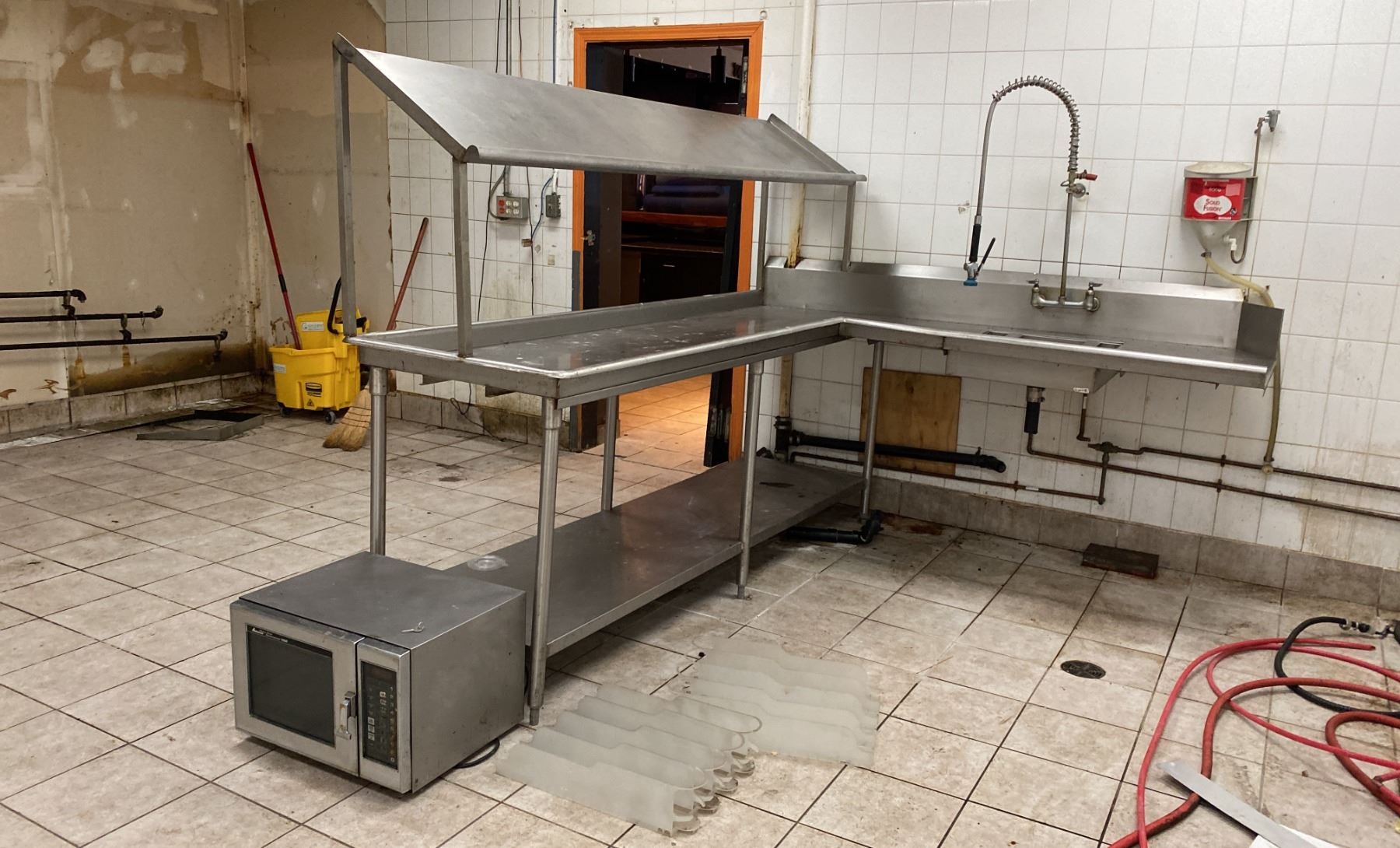 STAINLESS STEEL PREP STATION WITH SINK (ALREADY DISCONNECTED) APPROX 85 X 94" AND AMANA COMMERCIAL 1000 MICROWAVE