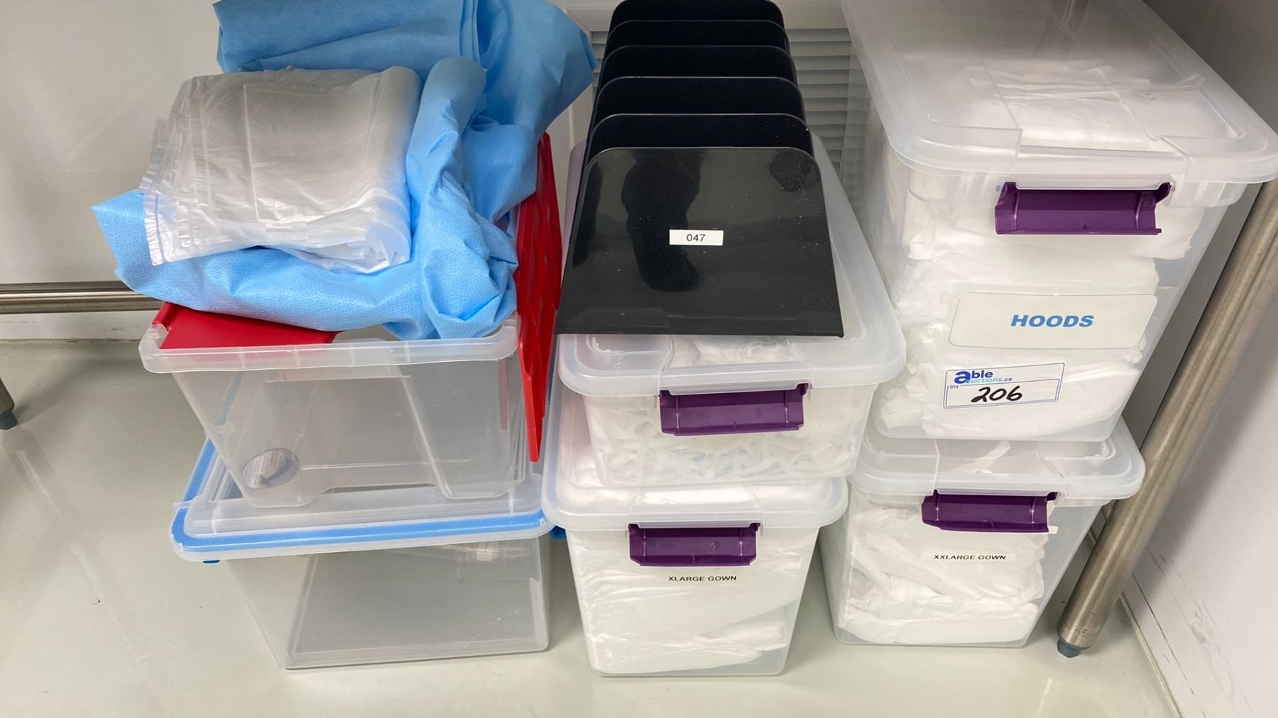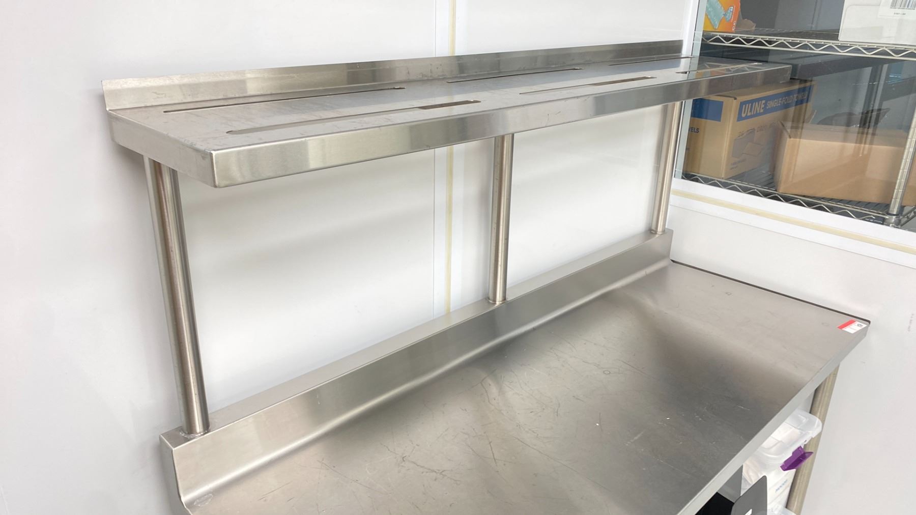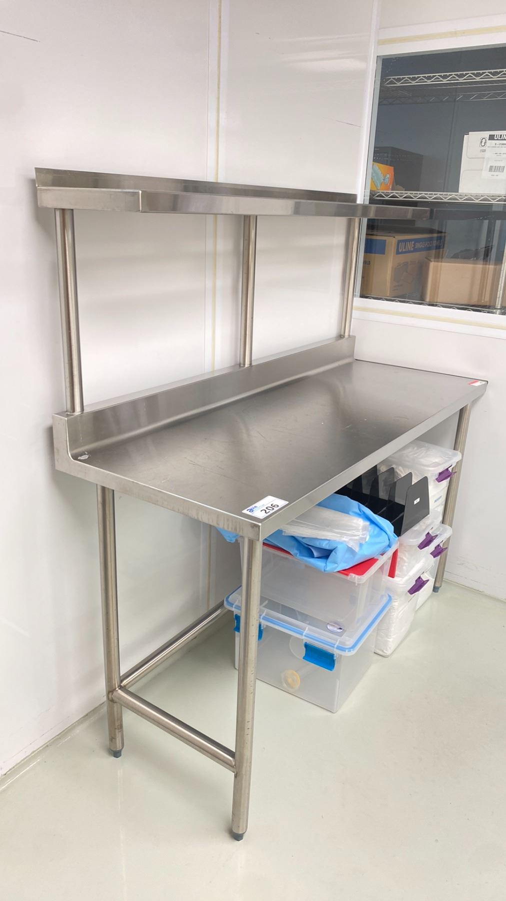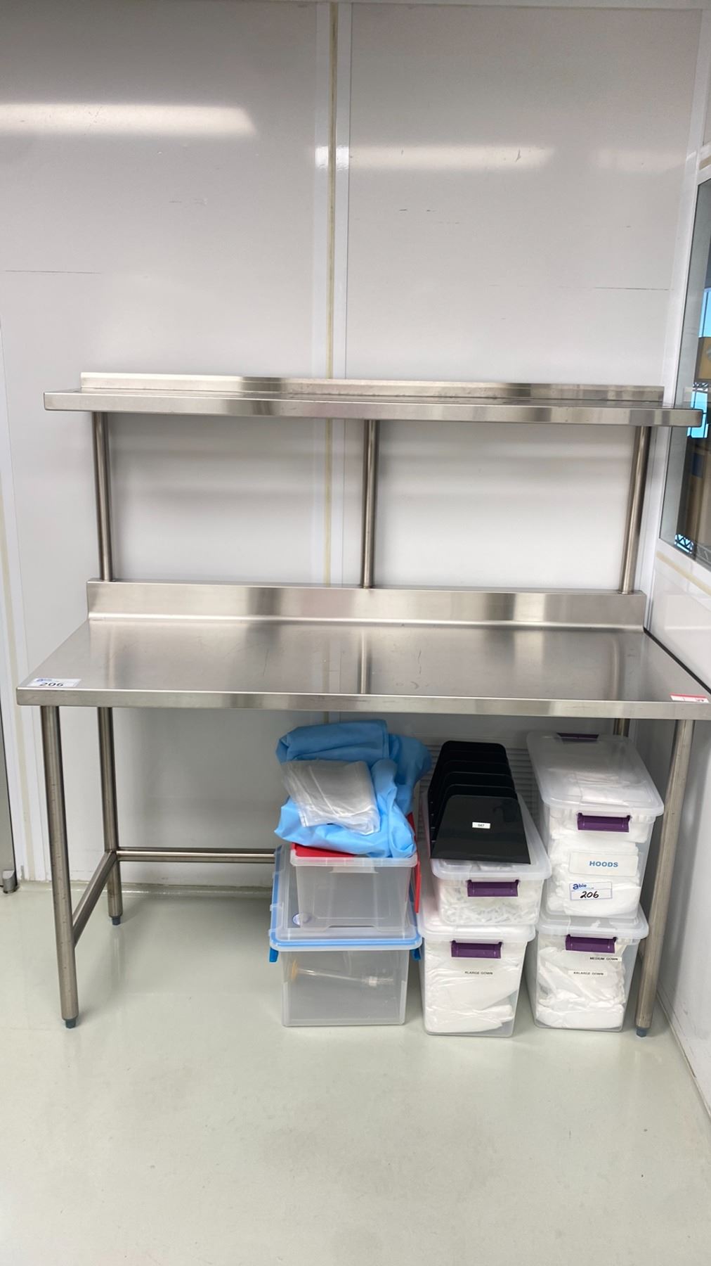 STAINLESS STEEL TABLE WITH BACKSPLASH AND SHELF APPROX 5' X 2' X 3' WITH GOWNS, HOODS AND MASKS